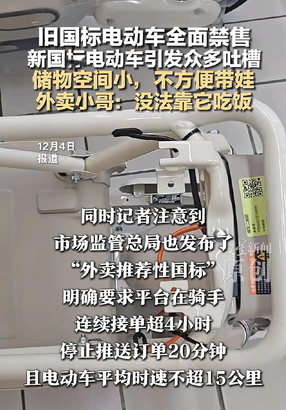 ! 如果真的按新国标电动车生产的话,有很多人都不满,有网友说“储物空间小,不方便带娃外卖小哥:没法靠已吃饭”。 而且,新国际电动车的车速太慢,如果骑自行车都不止25码,还不如乘坐地铁。 12月1日,以前的电动车禁止销售,新国标电动车的设计都安装有安全座椅。
