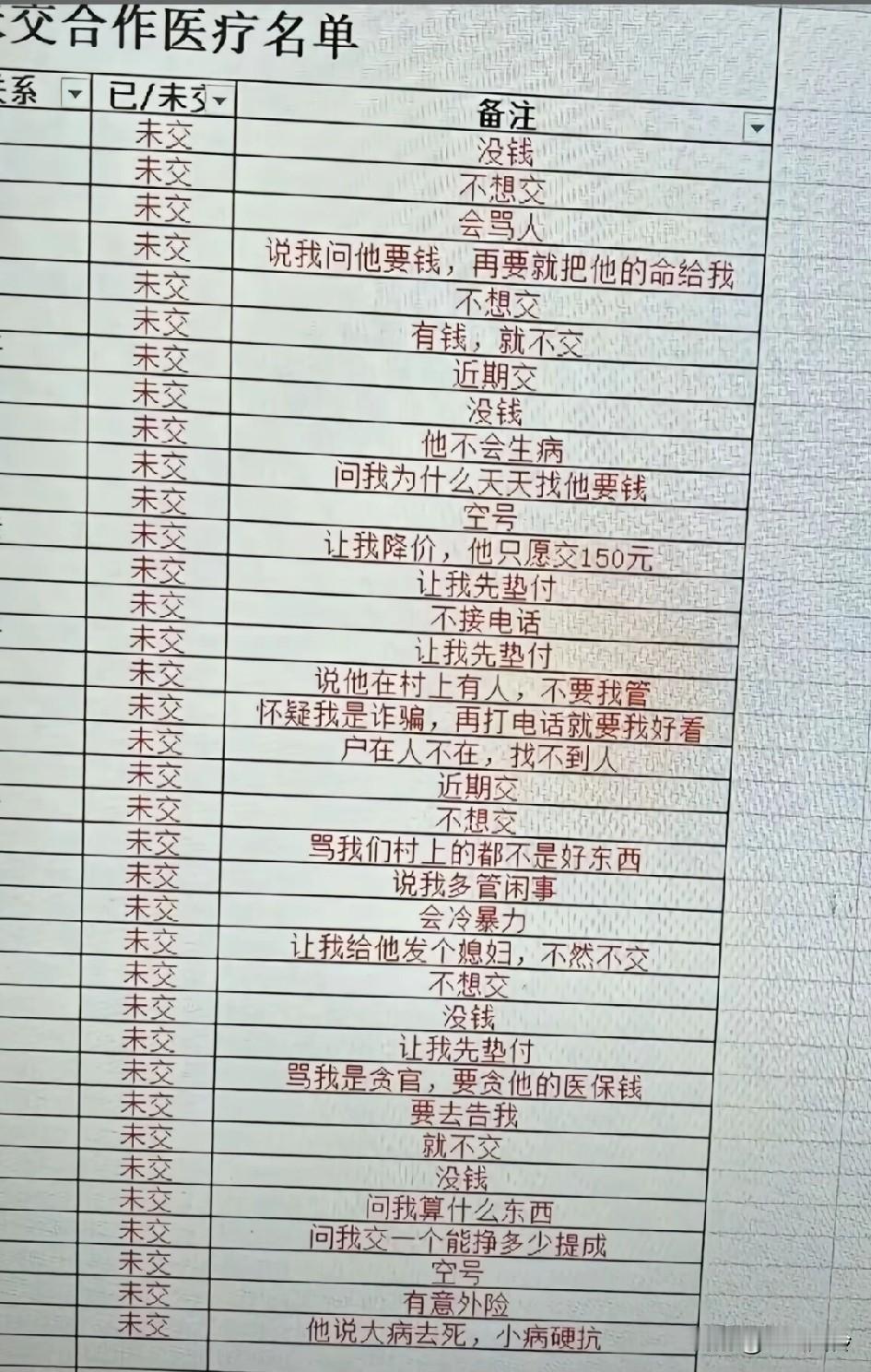 村群里也是这么说的,网格员群里发让交医保,村民说没钱不交,大病就死,小病扛着 备注亮点很多啊!村有个人说我身体好的很,不用交,他说老天爷会保佑他,所以不缴了。他们说:你是要我的钱去做生意还是吃利息还是发奖金……有人说要不你先给我垫上,看来各地都一样,真的都一样。