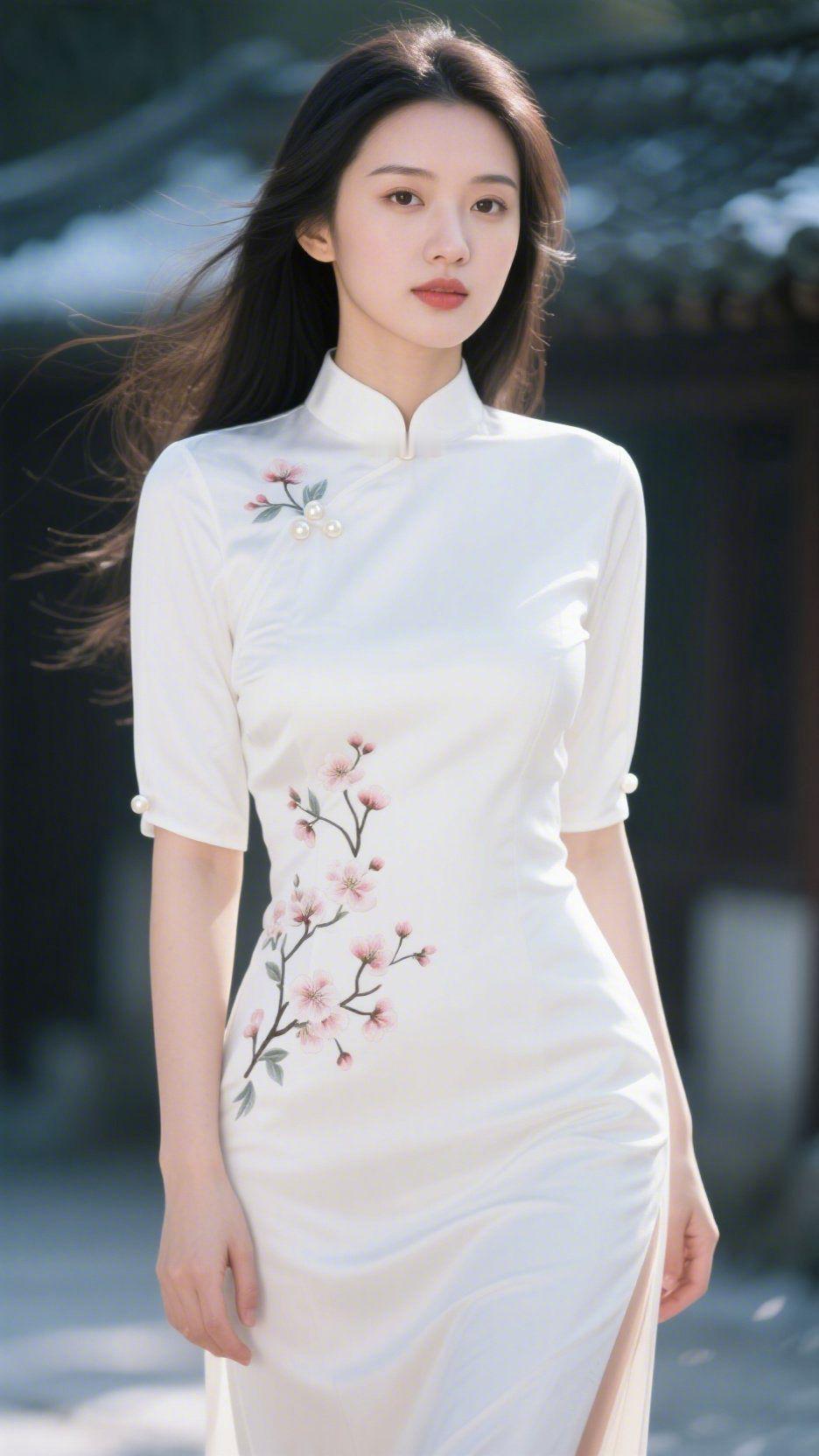 清风拂素裳 一袭素白旗袍,揉进了江南的清宁。立领处的珍珠如檐角落雪,襟边疏疏绘着几枝梅,浅粉的花瓣依着墨色枝桠,在顺滑的绸缎上晕开几分雅致。 微风掠过发梢,拂过青砖黛瓦的巷陌,步履轻缓间,时光也似被揉得柔软。眉目间的清和,风骨里的淡然,都被这一身素裳静静承载。 无需刻意描摹,无需张扬姿态,东方女子的清雅与从容,便在这一颦一步间尽显。旗袍所藏的,是刻进骨里的东方韵致,是岁月沉淀的温婉与自持。风过处,梅香隐约,人立于巷间,恰似一幅笔墨清浅的江南写意。 国风旗袍 东方美学