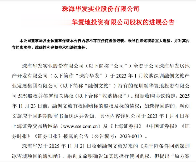 通知函显示,2023年1月,珠海华发收购融创文旅持有的深圳融华置地投资有限公司51%股权并签署相关协议(以下简称“收购协议”)。协议约定,融创文旅有权在2025年11月23日前回购标的股权及标的债权。