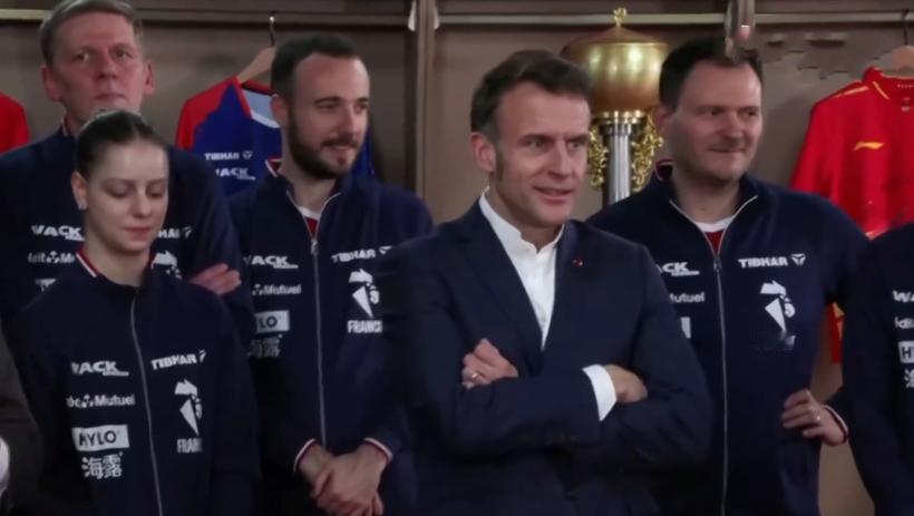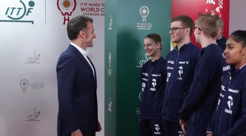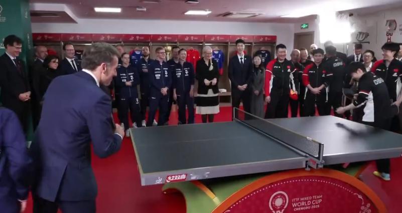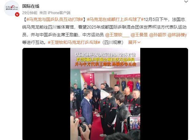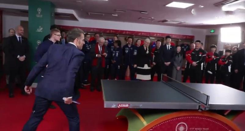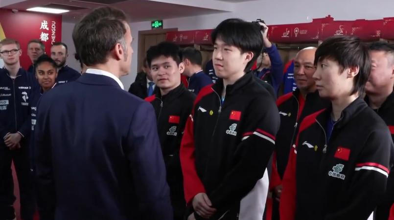 12月5日,马克龙在成都访问期间,还去了四川省体育馆。 值得一提的是,马克龙还有打乒乓球的天赋,在体育馆的时候,他还和法国运动员勒布伦组成了一队,并和运动员林诗栋、王楚钦、王曼昱等进行互动对练。引起不少网友的围观。 从曝光的画面中我们可以看出,马克龙打乒乓球还是有基础的,虽然他打的不是很好,可是基本上也都能接到对方的球,当然了这些专业运动员肯定都让着他。在打完乒乓球之后,马克龙还受到一个球衣。不得不说马克龙还真是一位很厉害的总统,不仅喜欢跑步,乒乓球也会一点。