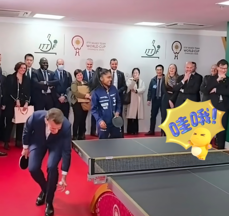 马克龙达乒乓球,拿球动作有模有样,还和专业运动员切磋球技!12月5日马克龙访问四川省体育馆,还与乒乓球运动员王楚钦打球,而且总统先生毫无架子,乒乓球掉在地上了亲自捡球。 还是头一次看法国总统打球,估计他之前也练过,不然也不会和专业运动员对打,只能说总统爱好广泛,健身不光是说说或者跑步,私下里肯定也练习打乒乓球了。 总统先生和运动员打完球后还与他们合影,站在运动员中间很有辨识度,毕竟运动员都穿着运动服,只有他穿着西服与白衬衫。