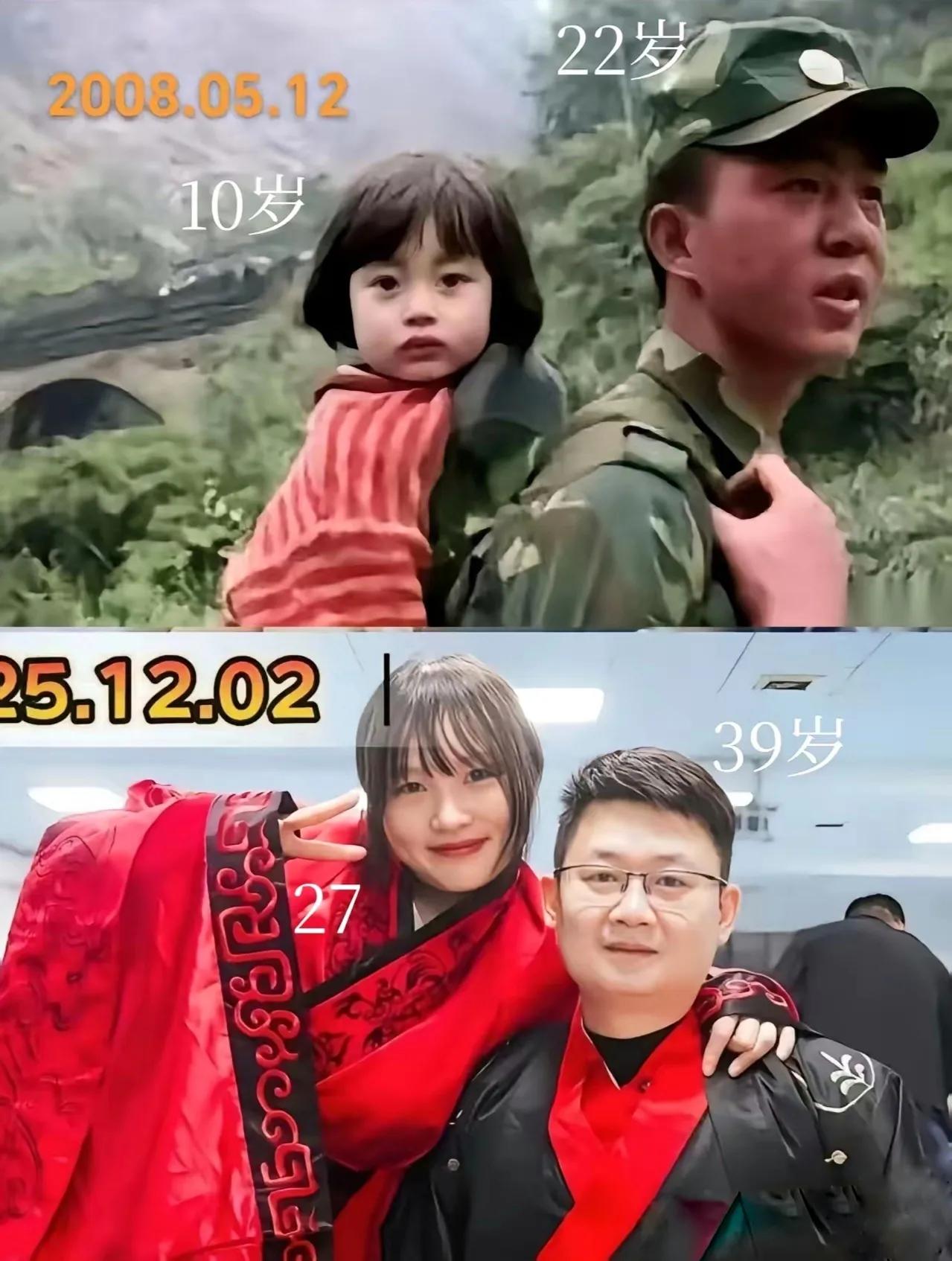 前世修来的缘!上图,2008年四川汶川大地震中,22岁的兵哥哥梁智斌背着刚刚救出来的10岁小姑娘刘喜美;下图,2025年12月,梁智斌和刘喜美结为夫妻。衷心祝愿两个人家庭幸福、白头偕老!同时,新郎要好好善待这位可怜的姑娘!