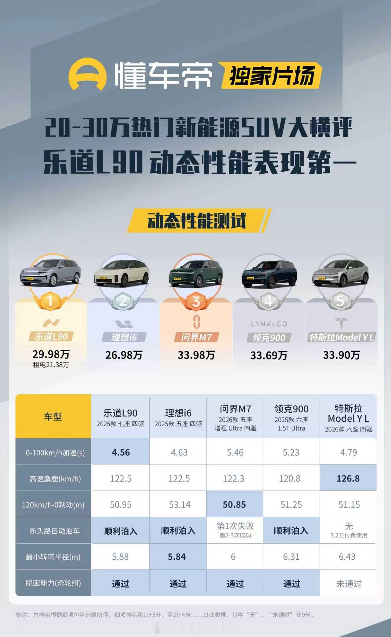 兄弟们,在懂车帝这波横评当中,乐道L90直接再次玩成了“个人秀”!上次6座SUV十车大战,乐道L90拿了第一我还觉得可能是运气;结果这次七座版再来,原班人马+原规则,照样领先同级,实现了两连冠!加速4.56秒、空间体验,这两项全排第一、满员续航不虚、补能成本最低,连哨兵模式都省到离谱——1.7kWh/天,某些车直接两倍、四倍往上走,这差距真不是一点半点。说真的,家庭SUV这赛道,乐道L90已经在增程/混动/纯电多种动力形式,多款车型当中稳稳的脱颖而出。大家来注意一个有趣的细节:综合排名靠前的还都是纯电车型。那如果预算30万左右的,别犹豫了,买乐道L90真的值!邹总买电车啦乐道L90汽场全开