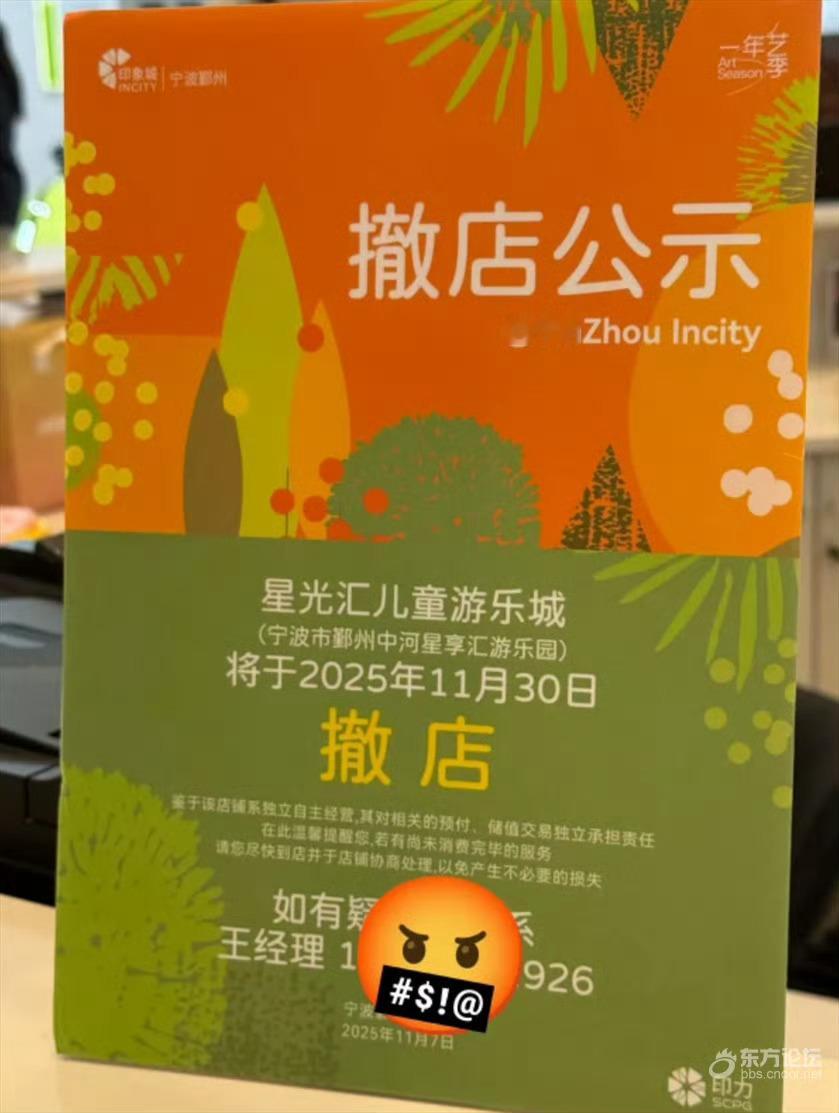 宁波又一家儿童游乐场宣布撤店 !位于知名商圈,但好多充值卡用户都不知情..宁波网友“孤酒情深”发帖,鄞州印象城门口的星光汇游乐园撤店了,没退款的朋友记得赶紧去:网友贴出了这家店的撤店公示,上面写明了撤店时间及相关负责人的联络方式,对于储值卡的处理暂未明示。公告发布时间则是11月1日。来源:东方热线