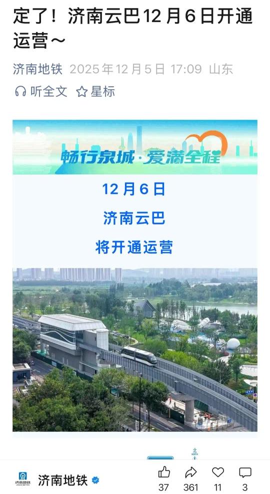 济南玩了一个大的:12.6云巴正式开通,12.5下午五点才偷偷贴出通知来。 不明白济南为啥这么做呢,老是半夜悄悄发通知。并不是说不能这么做,而是如此突然的通知会导致很多人不知道,开通首日的客流量必然会受到影响。 不过,话说回来这云吧还真不错,全长31公里,票价最高五块钱。高峰五分钟一趟,平峰11分钟一趟,首班车早晨6点,末班车晚上22点。 至于云巴能给高新东区带来什么样的变化,拭目以待吧。