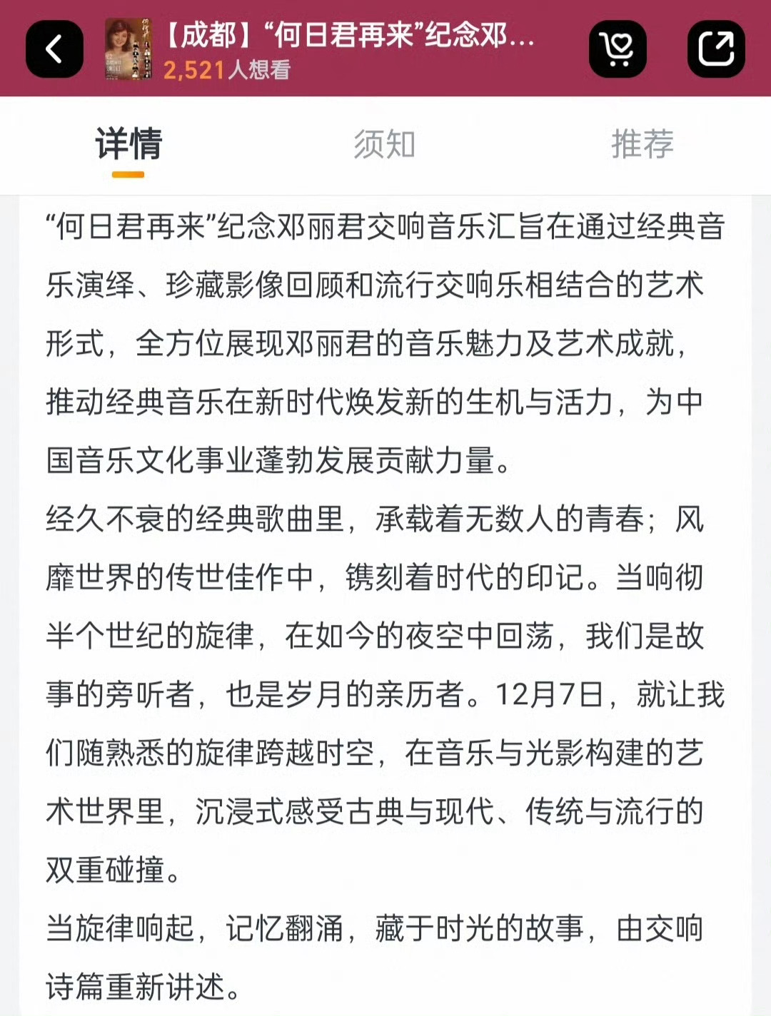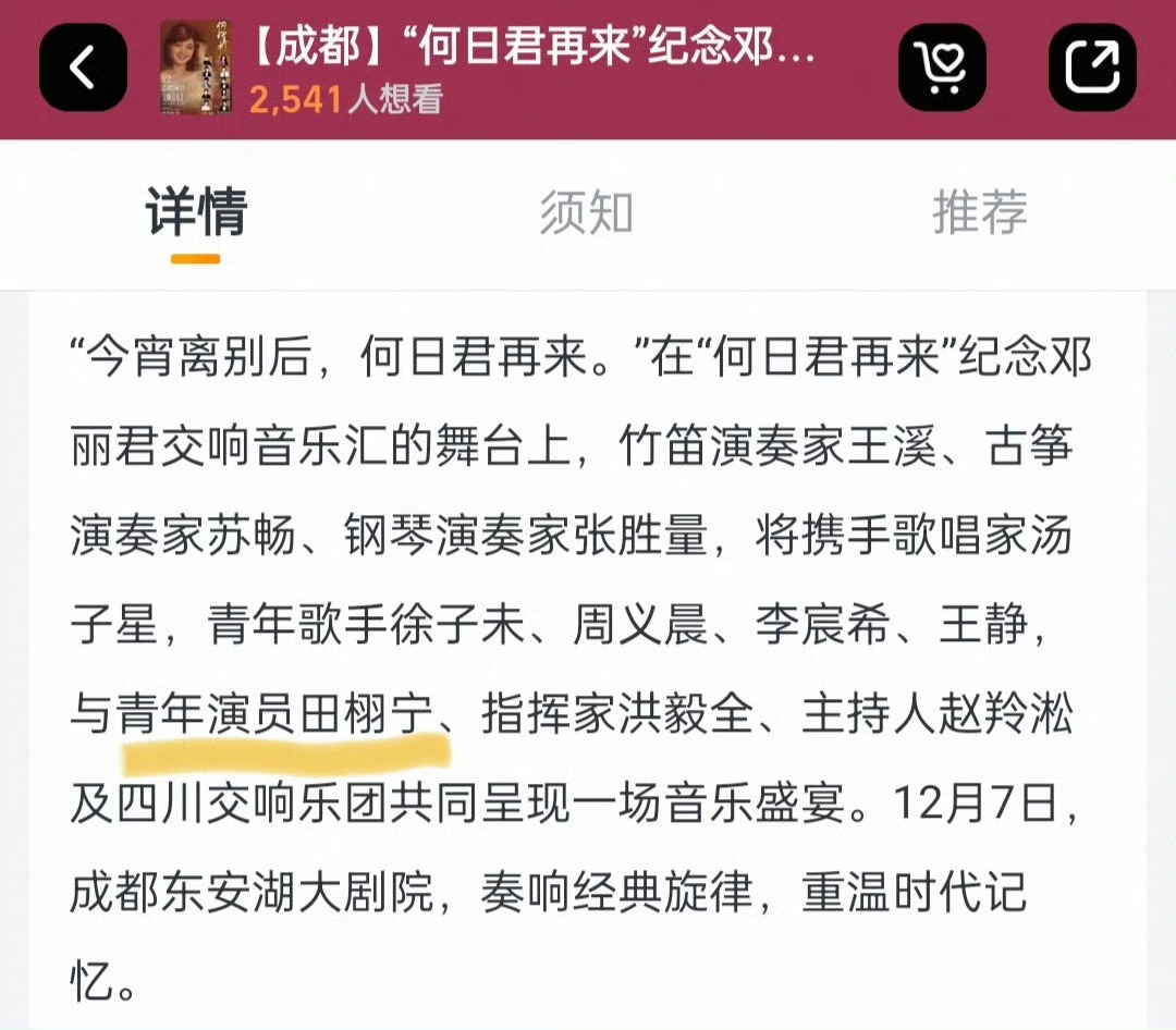 田栩宁确定参加纪念邓丽君交响音乐汇对接通知田栩宁确定参加何日君再来·纪念邓丽君交响音乐会!🎉12月7日晚七点半在成都东安湖大剧院期待田栩宁! 田栩宁雪中执伞