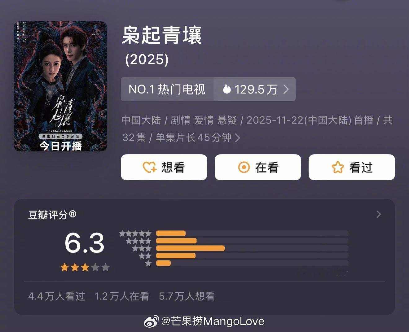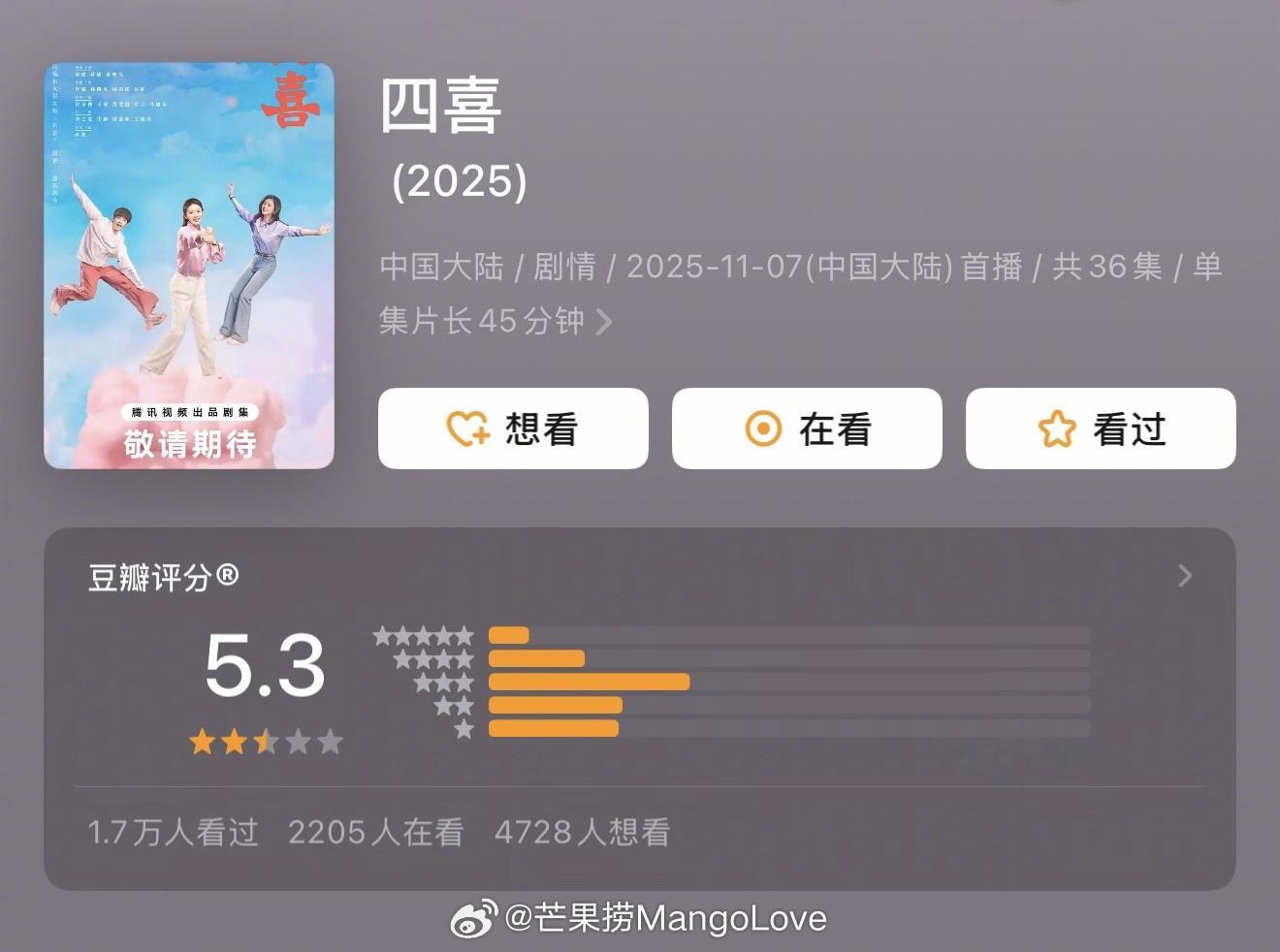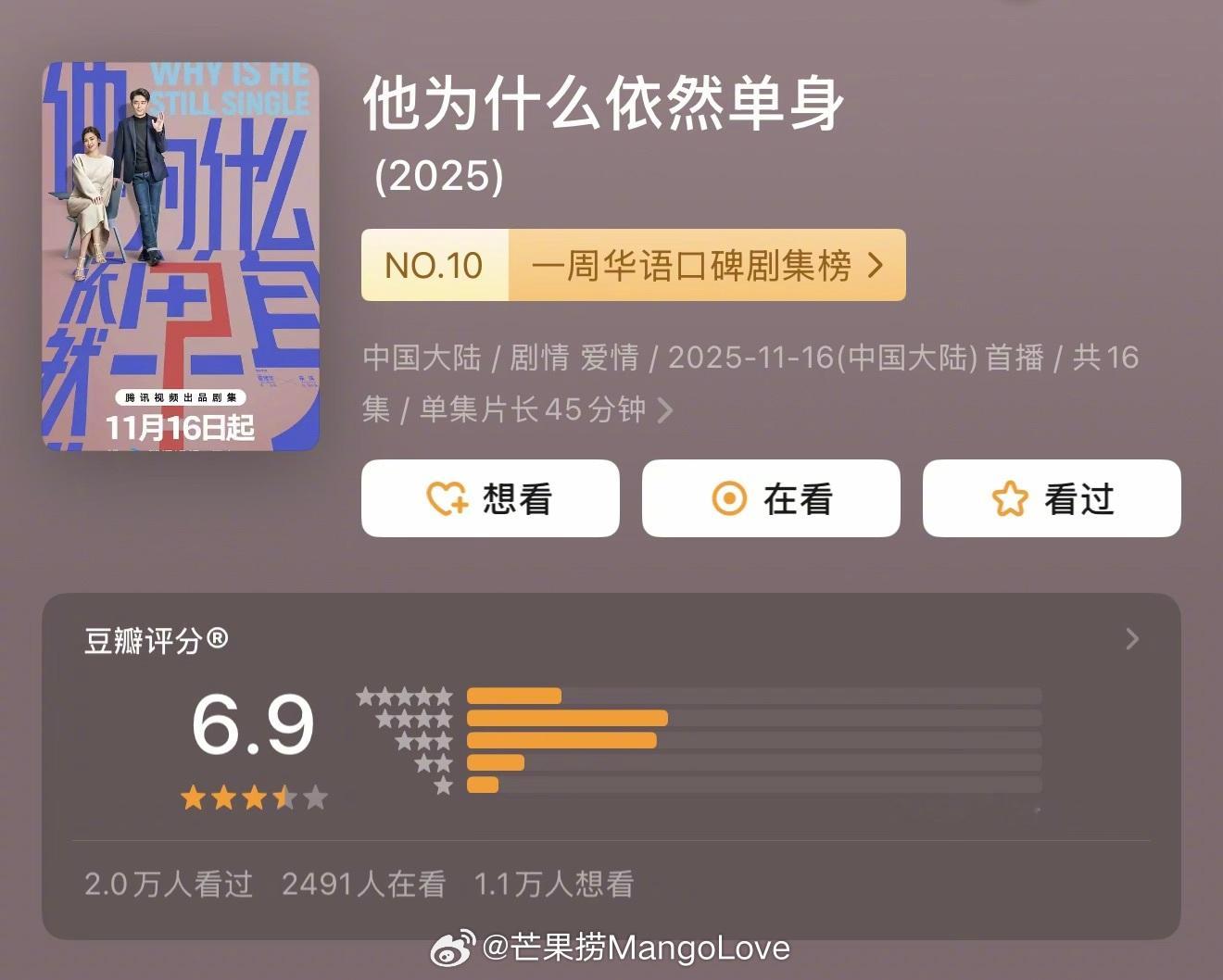 近期热播剧集豆瓣评分开分陈晓 / 孙千 大生意人 7.3分霍建华 / 朱珠 他为什么依然单身 6.9分迪丽热巴 / 陈星旭 枭起青壤 6.3分童瑶 / 蒋欣 / 黄明昊 四喜 5.3分