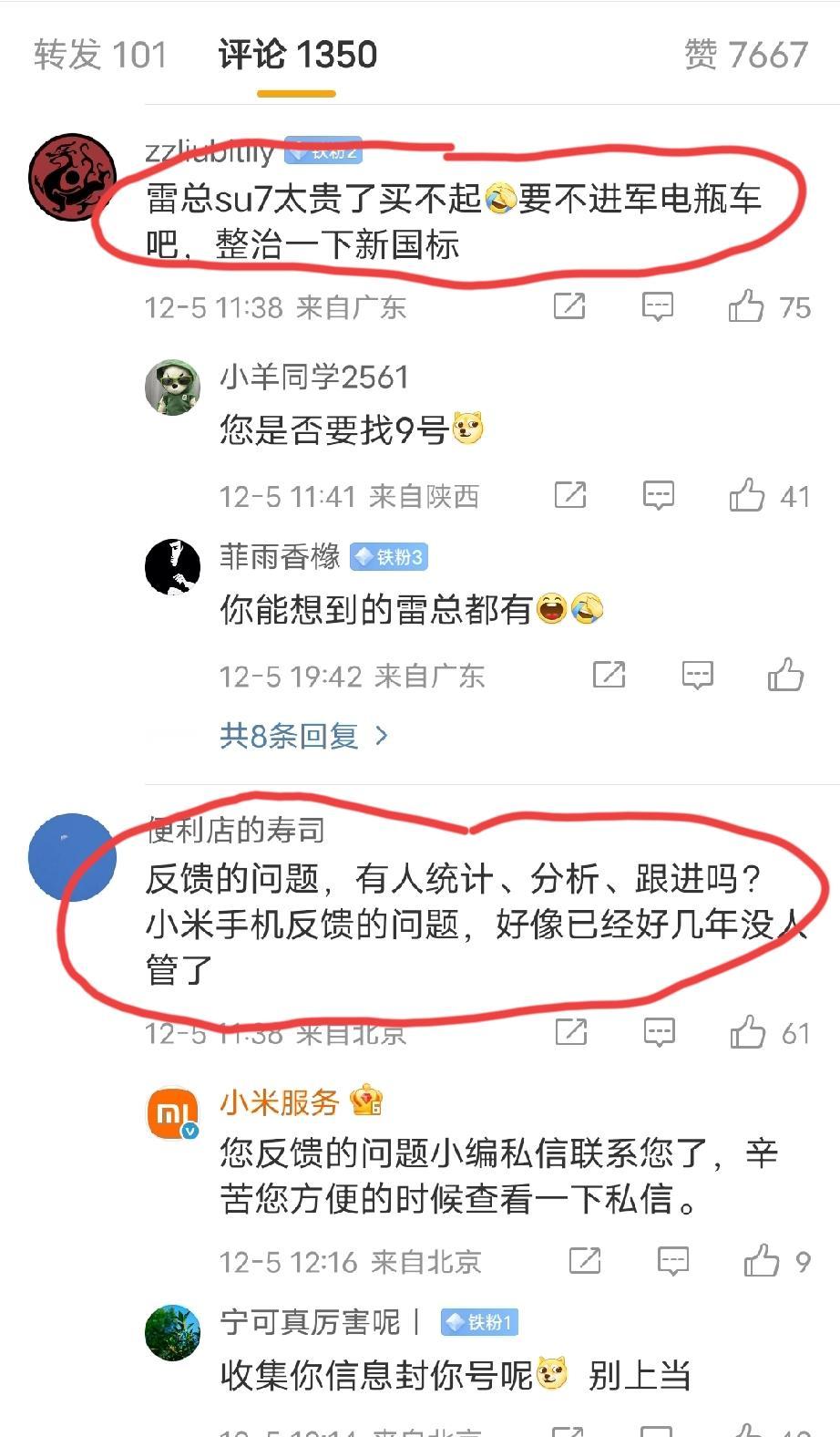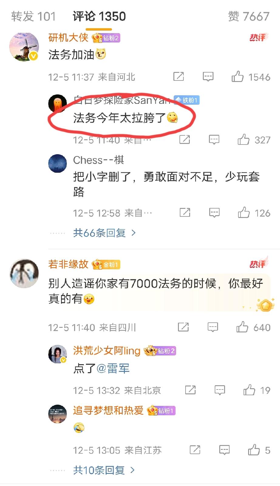 雷总非常诚恳的征求大家的意见:大家提提意见,明年我们如何可以做的更好? 评论区也是什么样的意见都有。有聊法务的“法务今年太拉胯了,明年法务加点油”;有让雷总明年进军电动自行车市场的,让他好好的整治一下新国标电动车的;也有让雷总重视消费者的小米手机反馈问题的。 最让人无语的一个意见是让雷总把人家11.11的冰箱给兑付的。[我想静静][我想静静][我想静静] 雷总太难了,事无巨细都要操心!!!