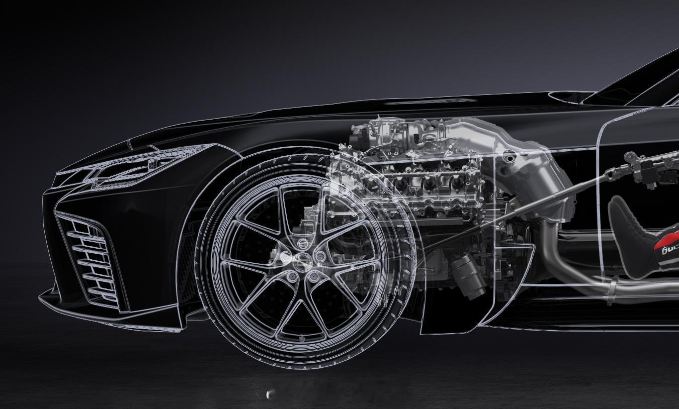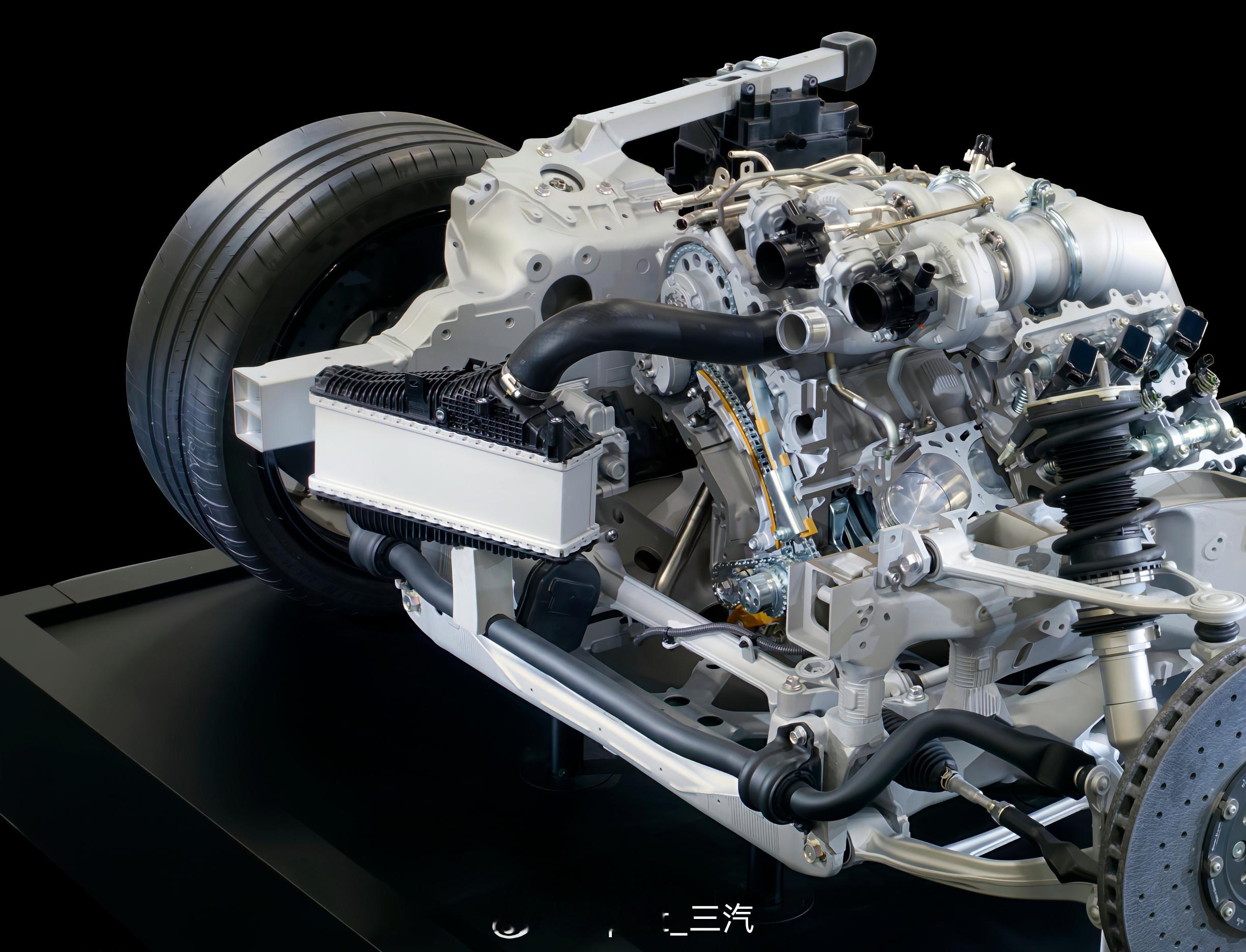 设计GR GT和GR GT3 那个前悬很长的设计大致原因就是V8看这图就知道、虽然V8主体布置在前轴之后但水冷中冷器被迫布置到发动机之前,因为没高度啊,机罩高度几乎和轮子等齐只能往前布置,结果就是把轮子的前端都占满(图中只显示一个,还有另一个没摆出来)然后还有水箱呢,没准水箱得斜着放,一斜就意味着占长度再叠加空力设计长前悬就出来了 扁车头其实没啥空间可用,得纵向找地方