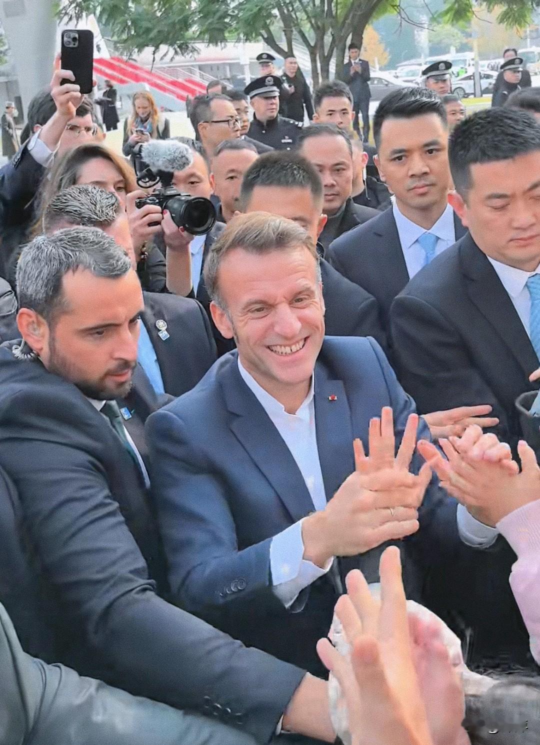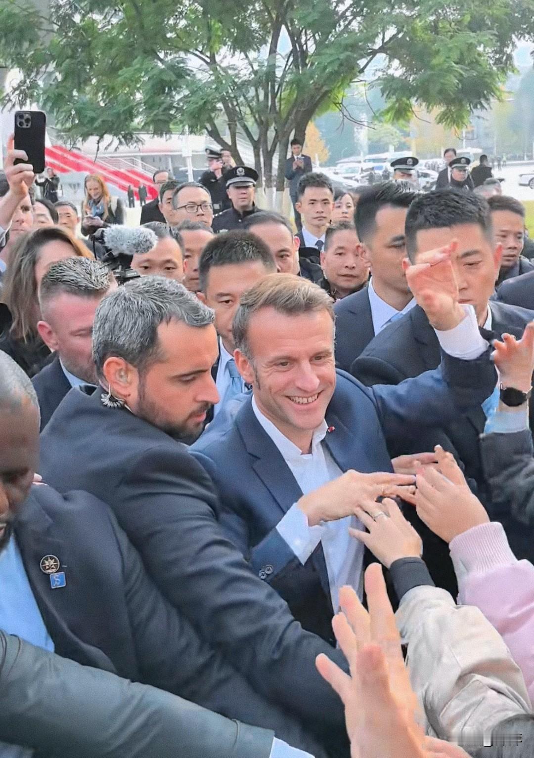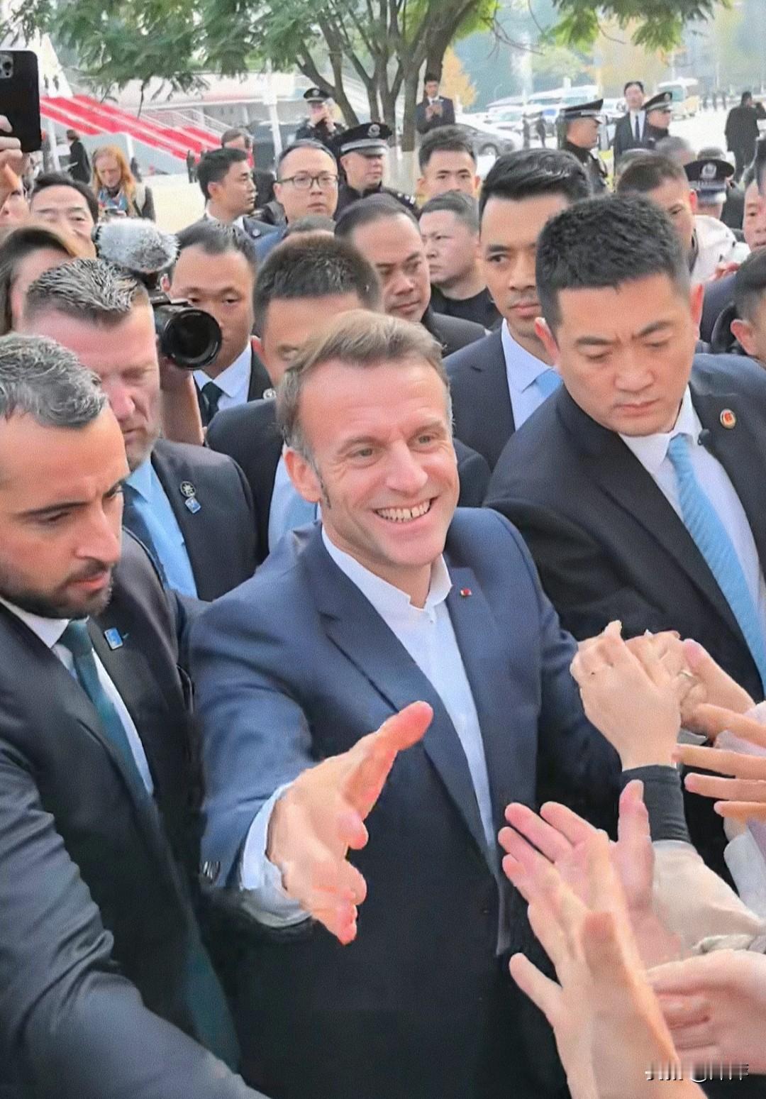 马克龙在四川大学受到热情的欢迎,同学们热情欢呼!他也很高兴和同学们握手打招呼。估计他自己都想不到他这么的受欢迎!