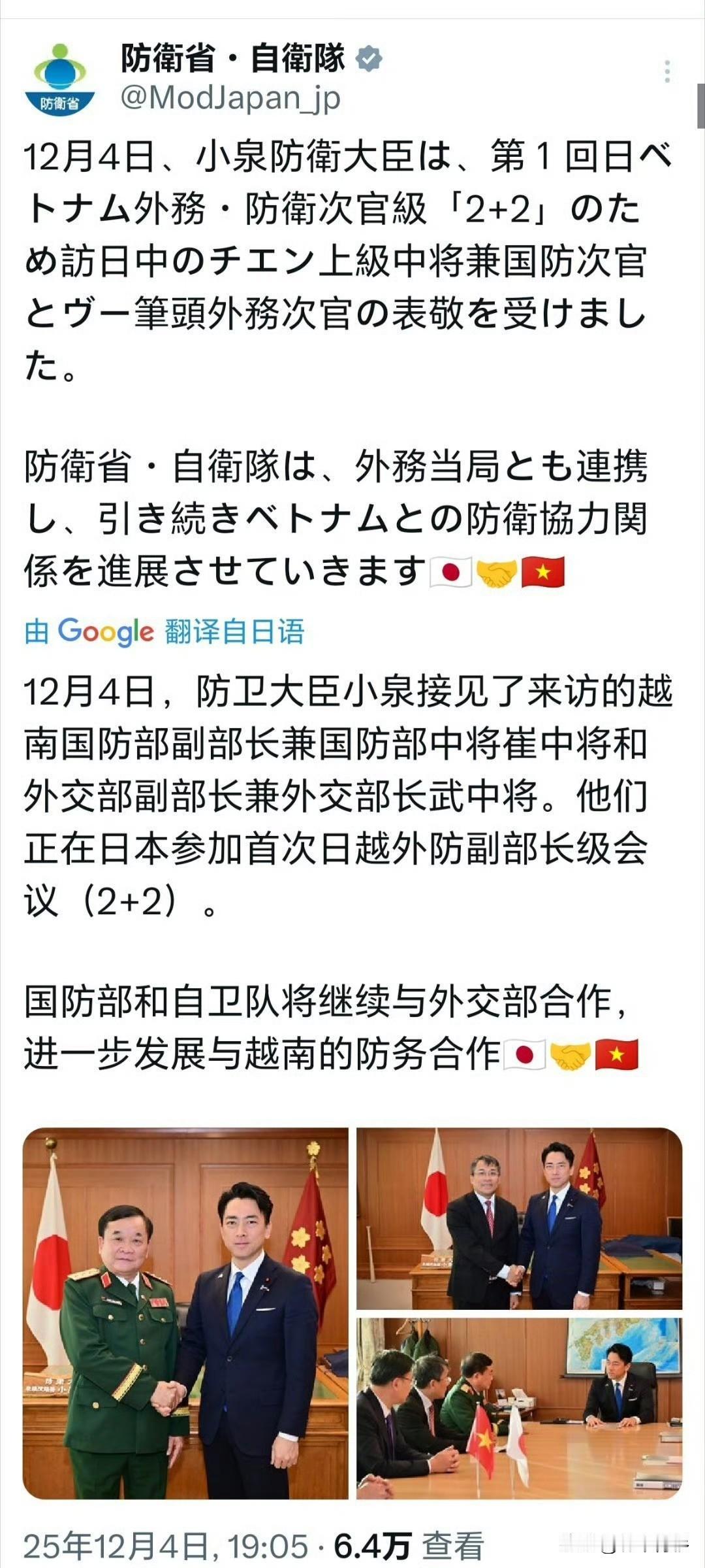 在这个时间点,这个国家的国防部副部长去会见日本防卫大臣,意欲何为呢? 消息来源:日本媒体 12月4日据日本媒体报道,日本防卫大臣小泉与来访的越南国防部副部长及越南外交部副部长进行了会面! 双方称将继续推动越南国防部、日本自卫队与外交部门的合作,进一步发展双方的防务合作! 为何小泉会与越南国防部及外交部高层会面呢? 原来越南国防部副部长及外交部副部长正在日本参加日越两国的首次副部长级2+2会议,这一会议机制源于2025年4月日本首相石破茂访问越南时,两国领导人达成的共识。 不过该会议所聚焦的内容耐人寻味,本次会议两国主要聚焦于东海、南海、核威胁等区域热点问题!