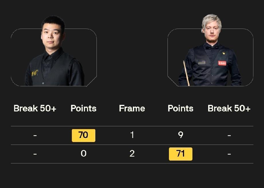丁俊晖 2-1 贾德·特鲁姆普 庞俊旭 1-1 尼尔·罗伯逊 11月5日晚21点,斯诺克英锦赛8进4上半区两场比赛拉开战幕。三次英锦赛冠军得主丁俊晖对阵世界排名第一的贾德·特鲁姆普、大黑马庞俊旭对阵大满贯得主、世界排名第三的尼尔·罗伯逊。