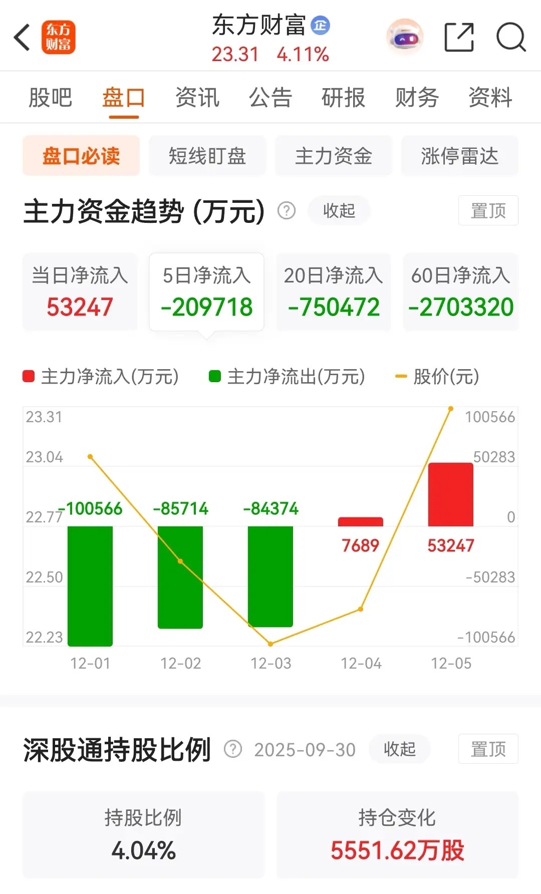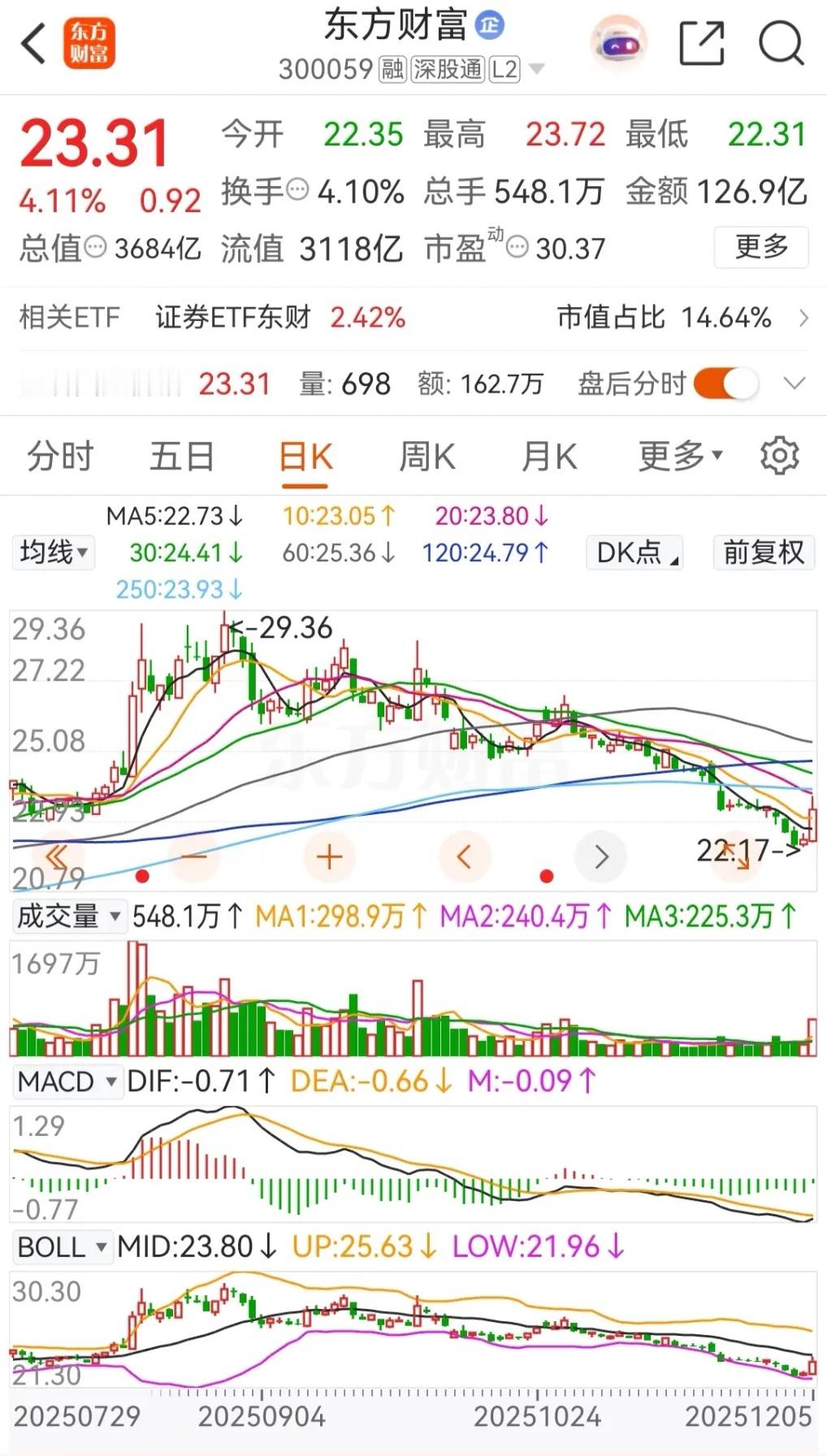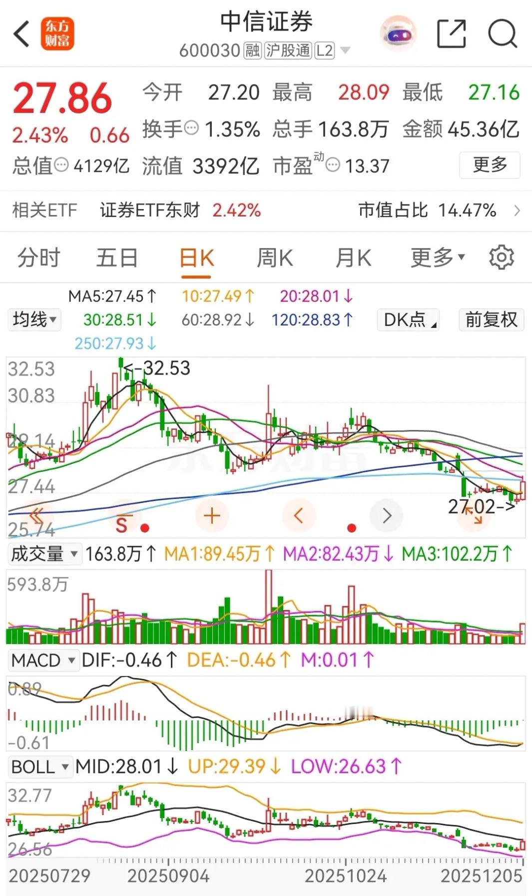 东方财富今天低开高走,大涨4.11%,连续2天被主力资金净买入;中信证券今天则是平开高走,上涨了2.43%。东方财富今天早盘低开后横盘整理,到了下午突然放量拉升,盘中最大涨幅曾一度达到了5.94%,收盘时回落到了4.11%,报价为23.31元,全天的成交金额为126.90亿元。在资金流向上,今天被主力资金净买入了5.3247亿元,目前已是连续两天被主力资金净买入了,近五个交易日则是合计被净卖出了 20.9718亿元。从走势上看,随着今天在低位的大涨,股价一举收复了五、十日均线,盘中差点就摸到了20日均线;周线则是连续两周收出十字星线,上周为缩量小十字星,本周则是放量大十字星线。中信证券今天的走势同东财差不多,早盘平开后横盘整理,到了下午突然放量拉升,最高涨幅曾一度高达 3.27%,回落后则收报于2.43%,收盘报价为27.86元,全天的走势金额为 45.36 亿元。在资金流向上,今天被主力资金净买入了约3.7814亿元,近五个交易日则是被主力资金合计净卖出了5.0723亿元。从走势上看,中信证券连续两天上涨,股价也收复了五、十日均线,盘中最高价时曾一度上穿过了20日均线;周线则是连续两周收出小阳线。至于更详细的技术分析,可以查看上一篇中关于今天券商概念板块走势的分析。下面简单说说券茅和券商一哥的估值情况,对于东方财富来说,存在着高估值风险: PE 37倍(行业平均20倍),股东数超 101万散户加剧波动,成交缩量即触发抛压。而中信证券则是有着防御属性:PE 17.58倍+股息率2.6%(分红率30%+),但信用减值损失陡增(Q3计提50亿)引发风控质疑。此外,目前券商概念板块的PB仅为1.52倍(历史40%分位),ROE预期70%分位,估值剪刀差存修复空间。