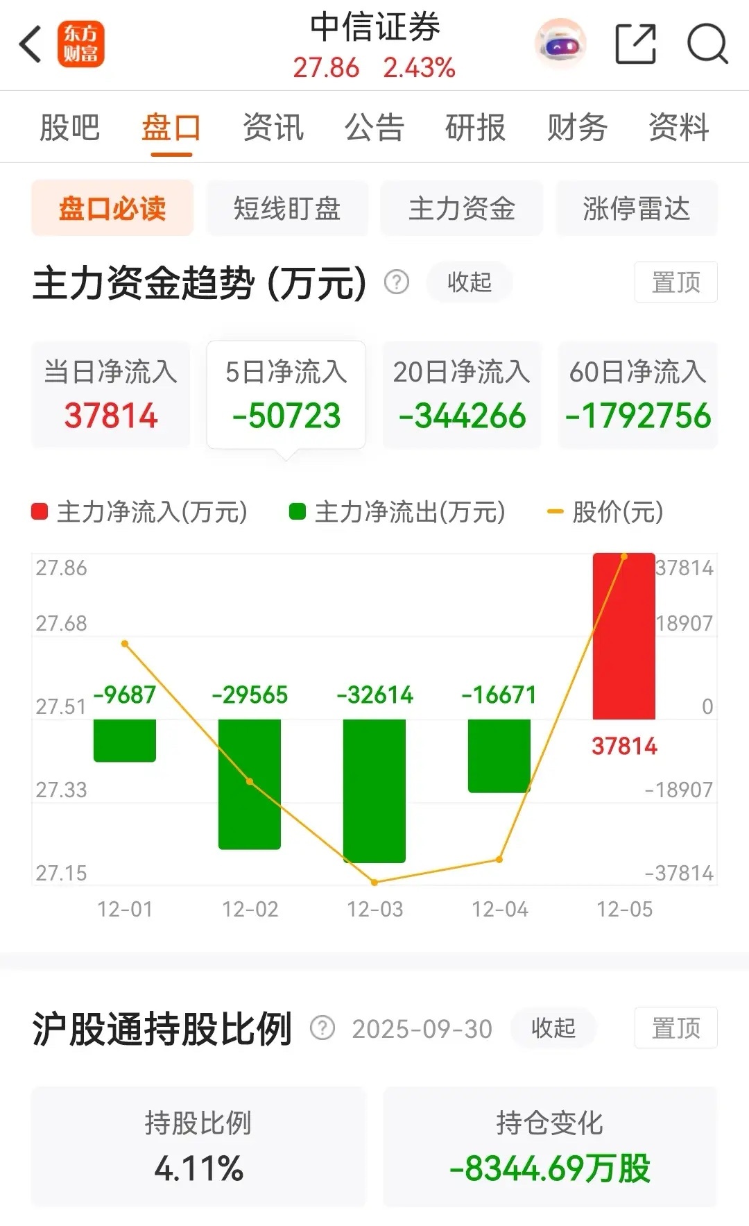东方财富今天低开高走,大涨4.11%,连续2天被主力资金净买入;中信证券今天则是