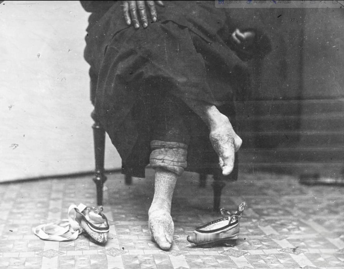 这张照片里的画面满是封建审美对女性的残酷压迫,女子裤脚挽起,露出的“三寸金莲”脚