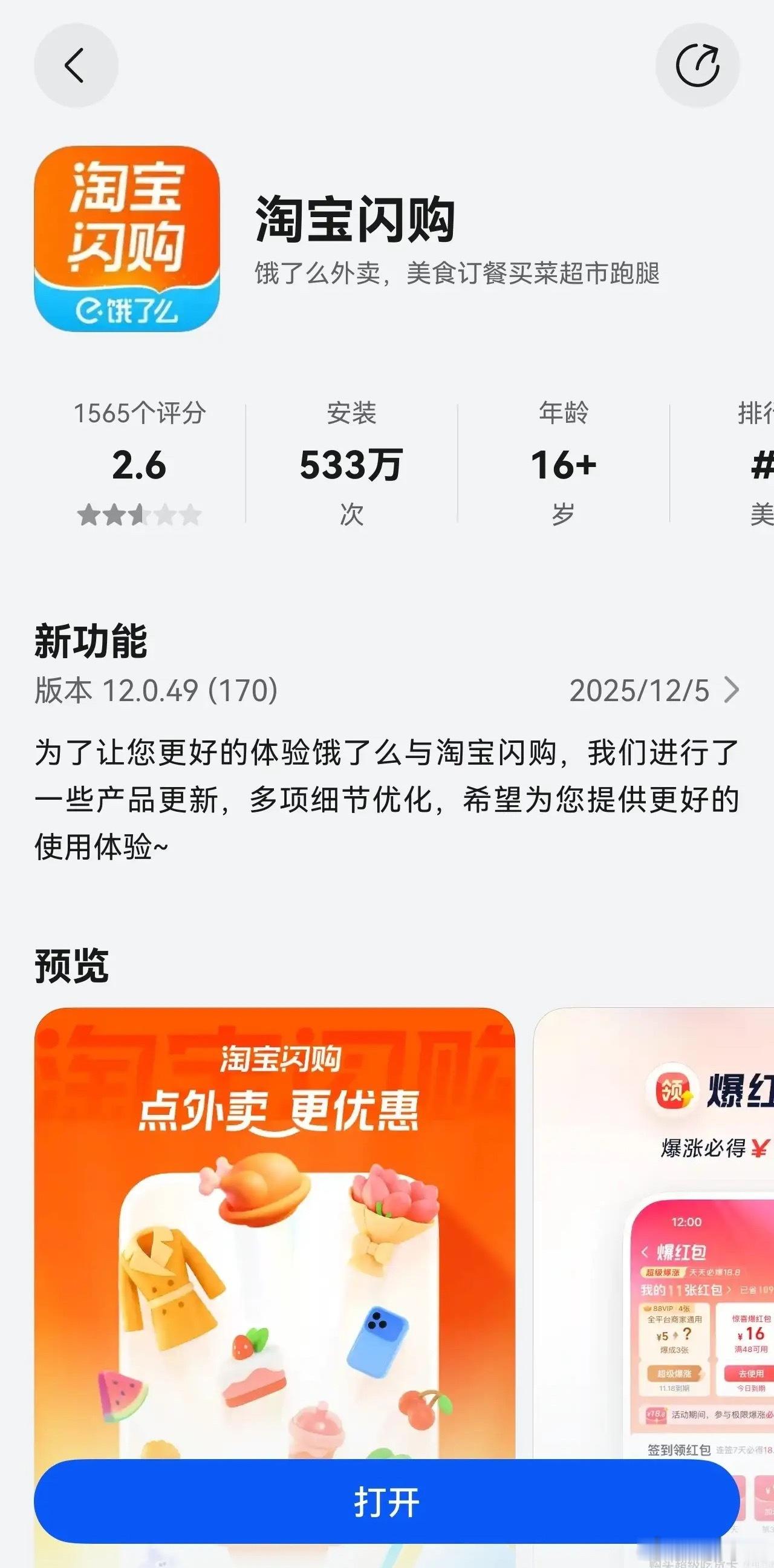 饿了么APP已更新为淘宝闪购饿了么更名为淘宝闪购,以后再也听不到你有新的饿了么订单。淘宝闪购十五号订单已被其他设备接单,若未打印小票请及时确认。淘宝闪购十五号订单已被骑士接单。淘宝闪购十五号、十四号订单出餐即将超时,请加紧出餐。淘宝闪购的这一次更新是全平台的,包括安卓、iOS和鸿蒙。我刚看了一下,在鸿蒙6的应用商店中搜索“饿了么”,也已经变成“淘宝闪购”。鸿蒙6现在也是第一时间用上新APP新功能了