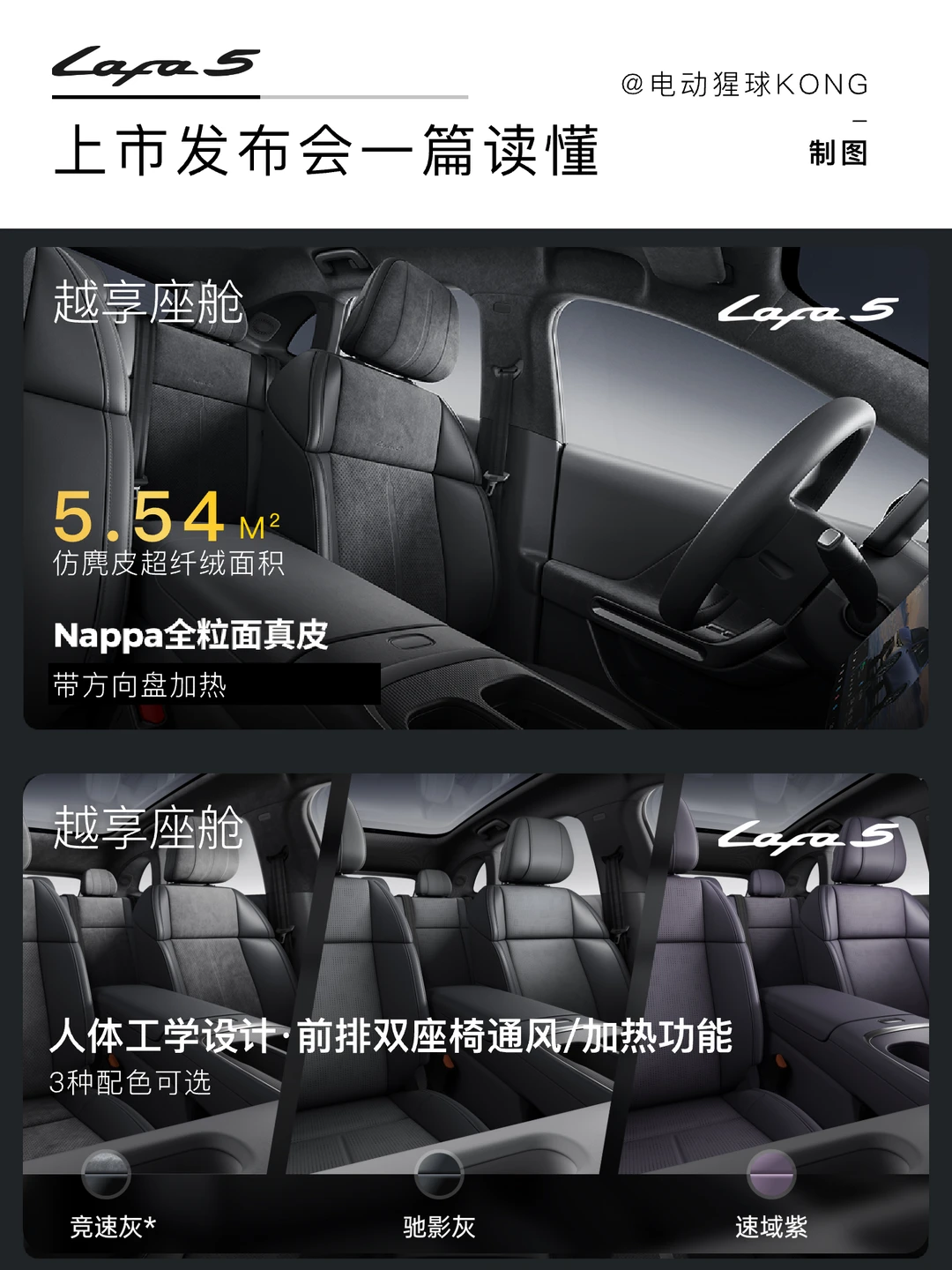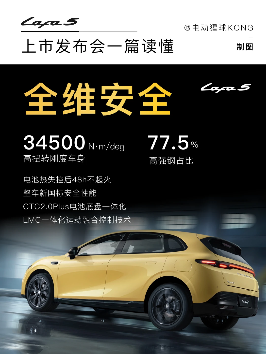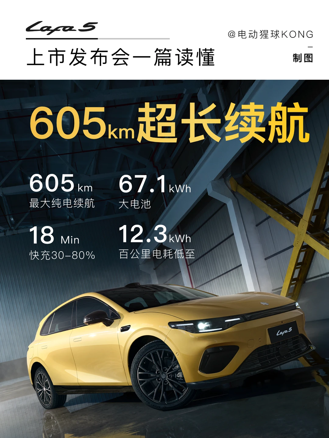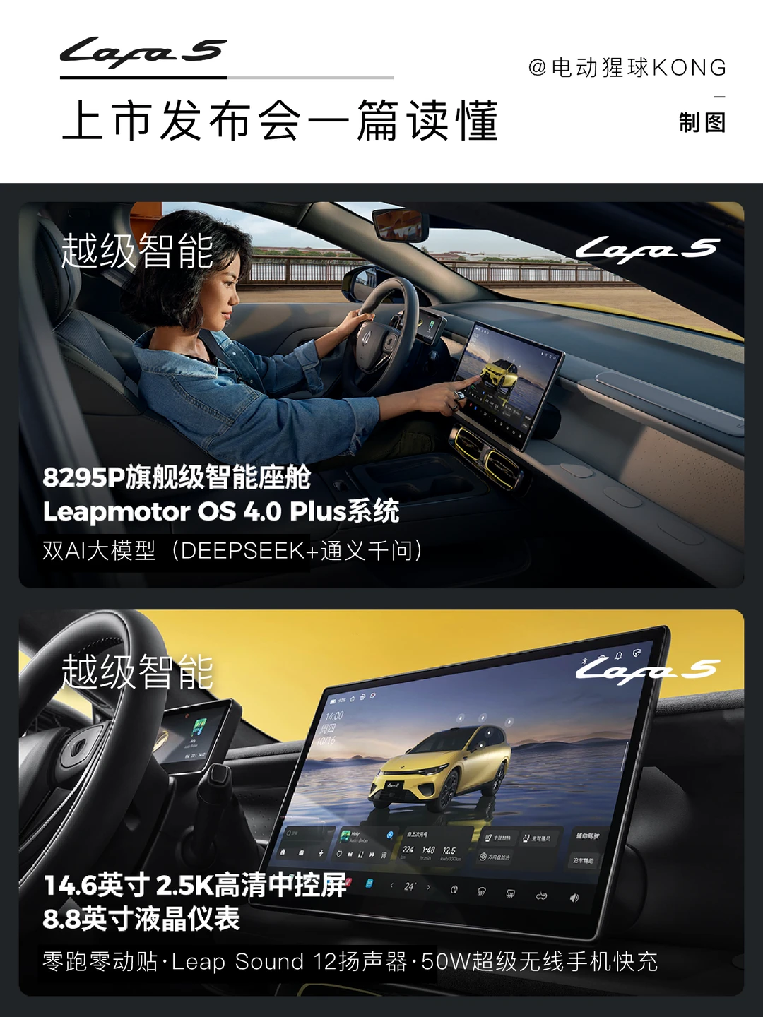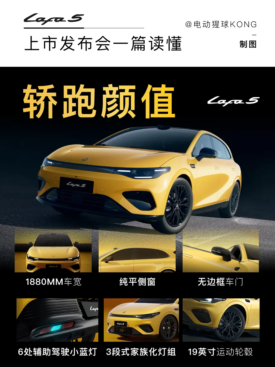 零跑Lafa5上市,值不值得买?花了2个小时总结,看这篇就够了: 1️⃣轿跑颜值 宽体车身溜背造型、短前后悬的轿跑姿态 全系无边框车门,开门瞬间玻璃微降,仪式感给够,尤其纯平侧窗非常高级 标配19英寸掠翼运动轮毂,颜值提升很大,同级还有在用16寸的 6种配色(车型专属色“风驰电掣”绝绝子)质感都比较年轻化! 6处辅助驾驶小蓝灯,家族化灯组,钢琴烤漆外饰,细节处理得不错 2️⃣愉悦驾控 中欧联合调校底盘,高速稳、低速顺,各种路况都适配 后置后驱,160kW大电机,零百加速6.4秒,支持弹射起步模式、专属UI动效,一脚加速情绪价值拉满 三种驾驶模式、自定义声浪,制动踏板感可调节,很个性化! 3️⃣越享座舱 环保座舱,5.54m²仿麂皮超纤绒、Nappa全粒面真皮拼接内饰,超80%软包覆盖率,质感没的说 86%超高得房率,带来宽敞前后排空间,1.02㎡超大全景天幕、电动遮阳帘,防晒又通透 4️⃣越级智能 激光雷达配端到端辅助驾驶,搭载8295P、8650旗舰双芯片,车机流畅度没的说 双AI大模型(DeepSeek、通义千问),支持方言识别、多轮对话、全场景可见即可说 14.6英寸2.5K中控屏、8.8英寸仪表,搭配Leap Sound 12扬声器,还有无麦K歌 5️⃣超长续航 至高605km纯电续航,日常通勤一周一充,跨城出行无压力 30%-80%快充最快仅需18分钟,喝杯咖啡的时间就能满电出发 0.256超低风阻系数,搭配AGS主动进气格栅,百公里电耗低至12.3kWh,续航更实在 6️⃣全维安全 34500N・m/deg高扭转刚度车身(豪车配置),77.5%高强钢占比,非常舍得给料 LMC一体化运动融合控制,起步不打滑,紧急避障更稳定 电池底盘一体化技术,电池热失控后48h不起火,满满的安全感 💡总的看下来,对这辆车最满意的是颜值,这个级别和预算,找一个好看的车很难得。零跑Lafa5“颜值、操控、舒适、智能、安全”全维度无短板,值得推荐~ 最后,手握10多个W,你会怎么选?