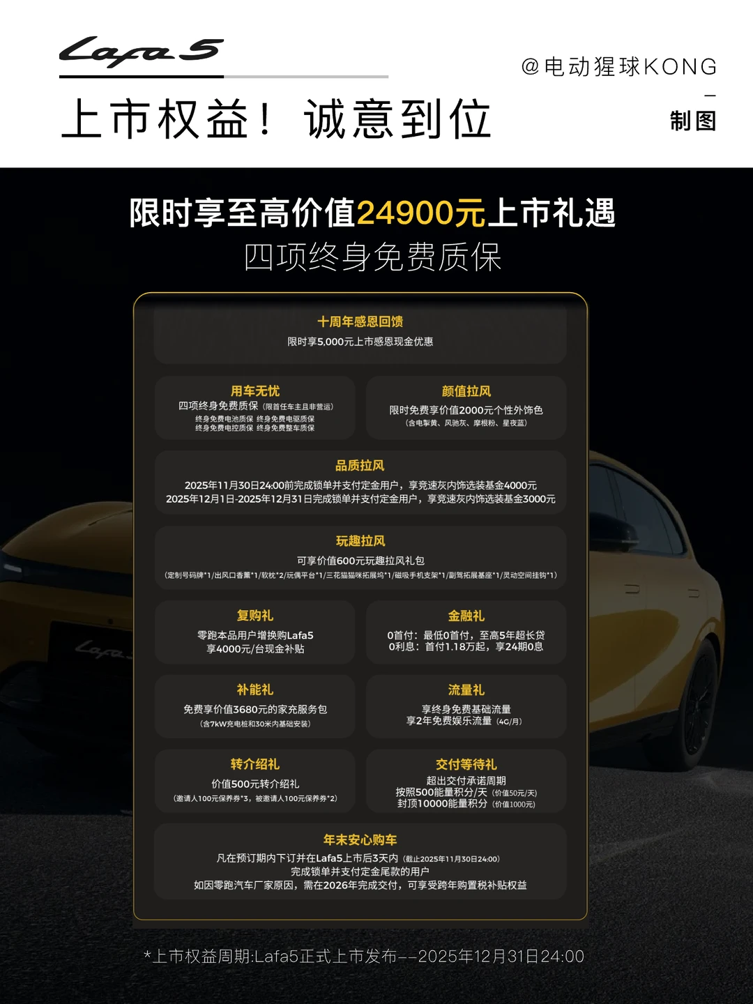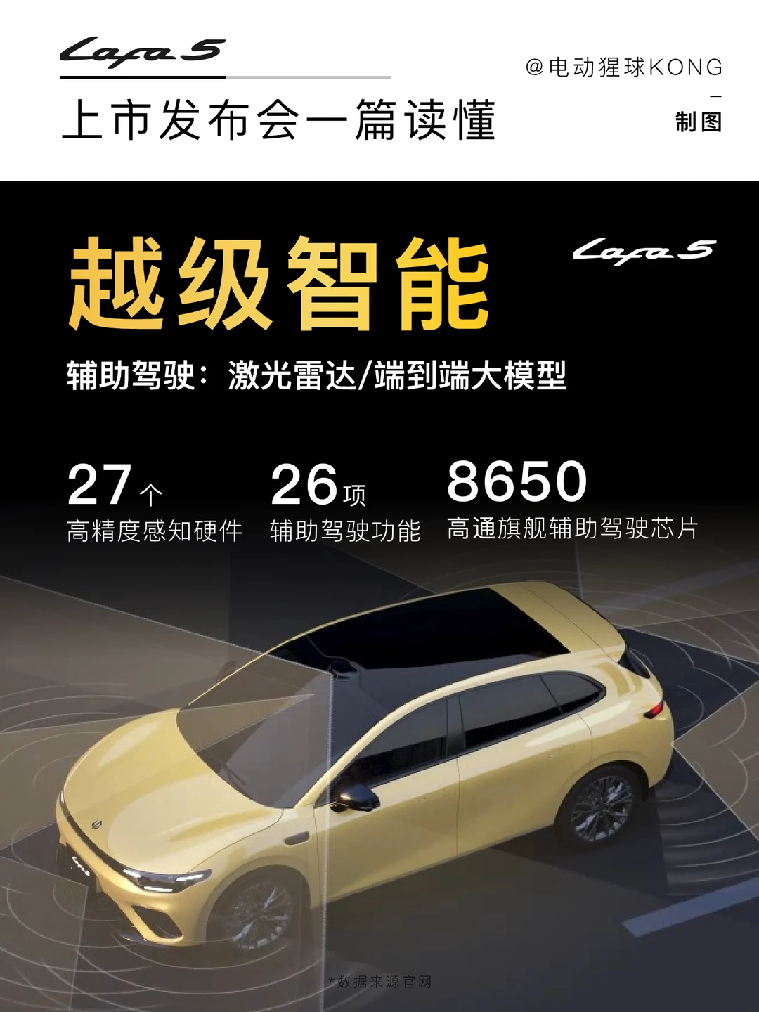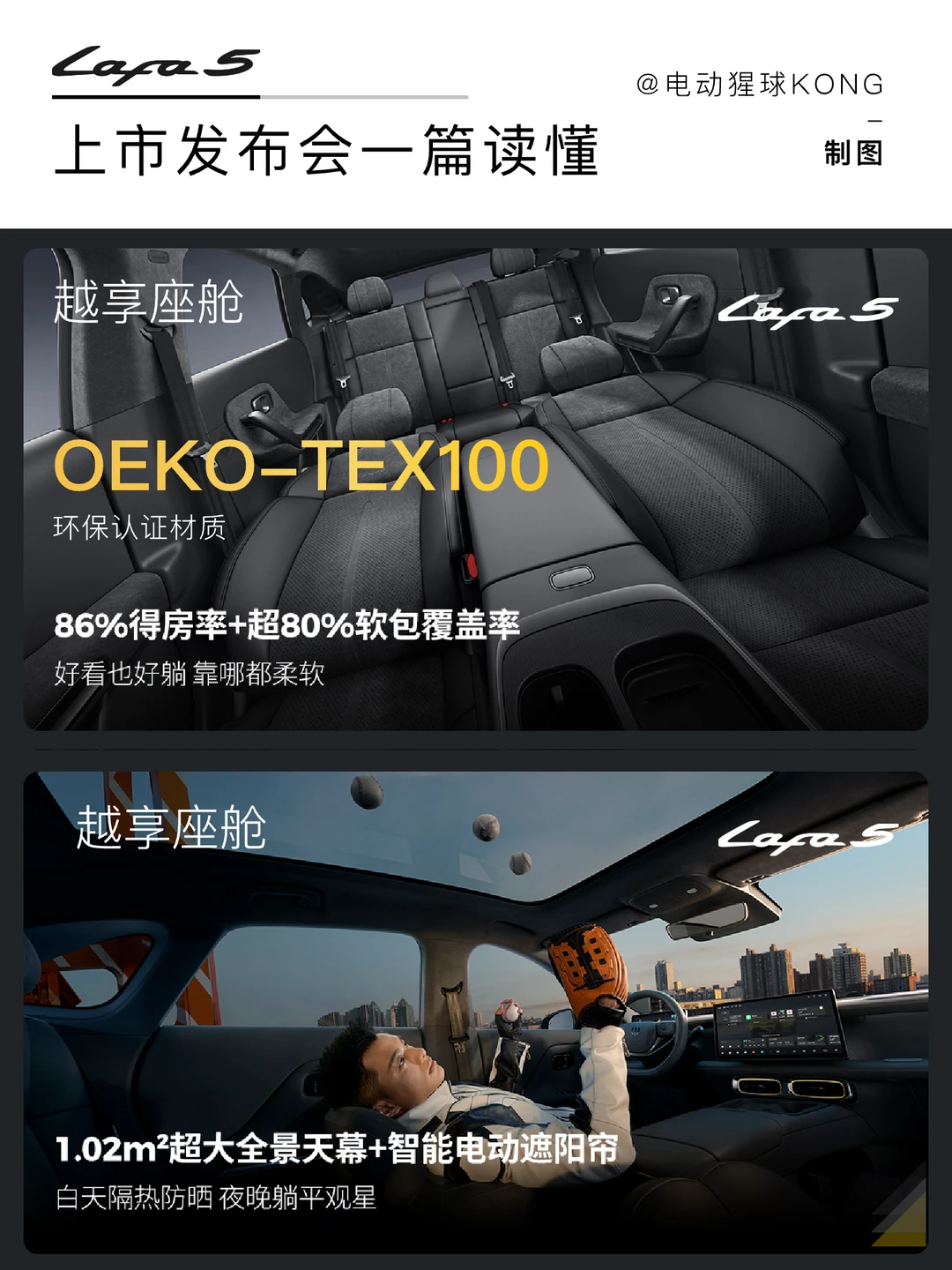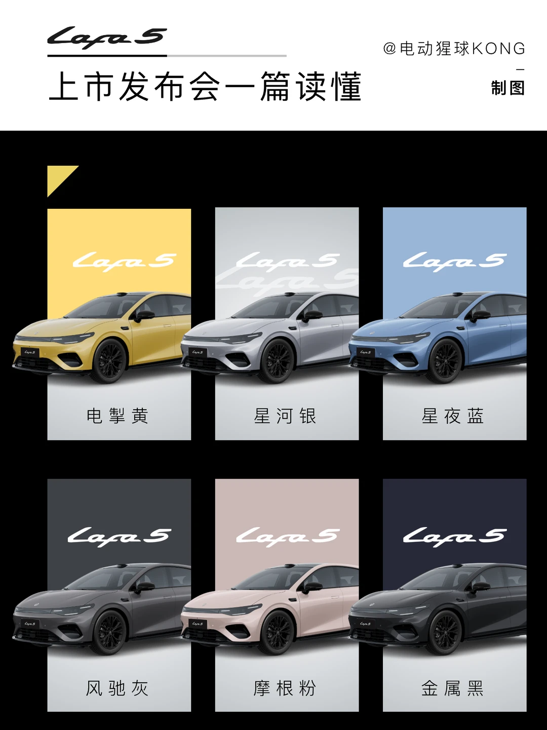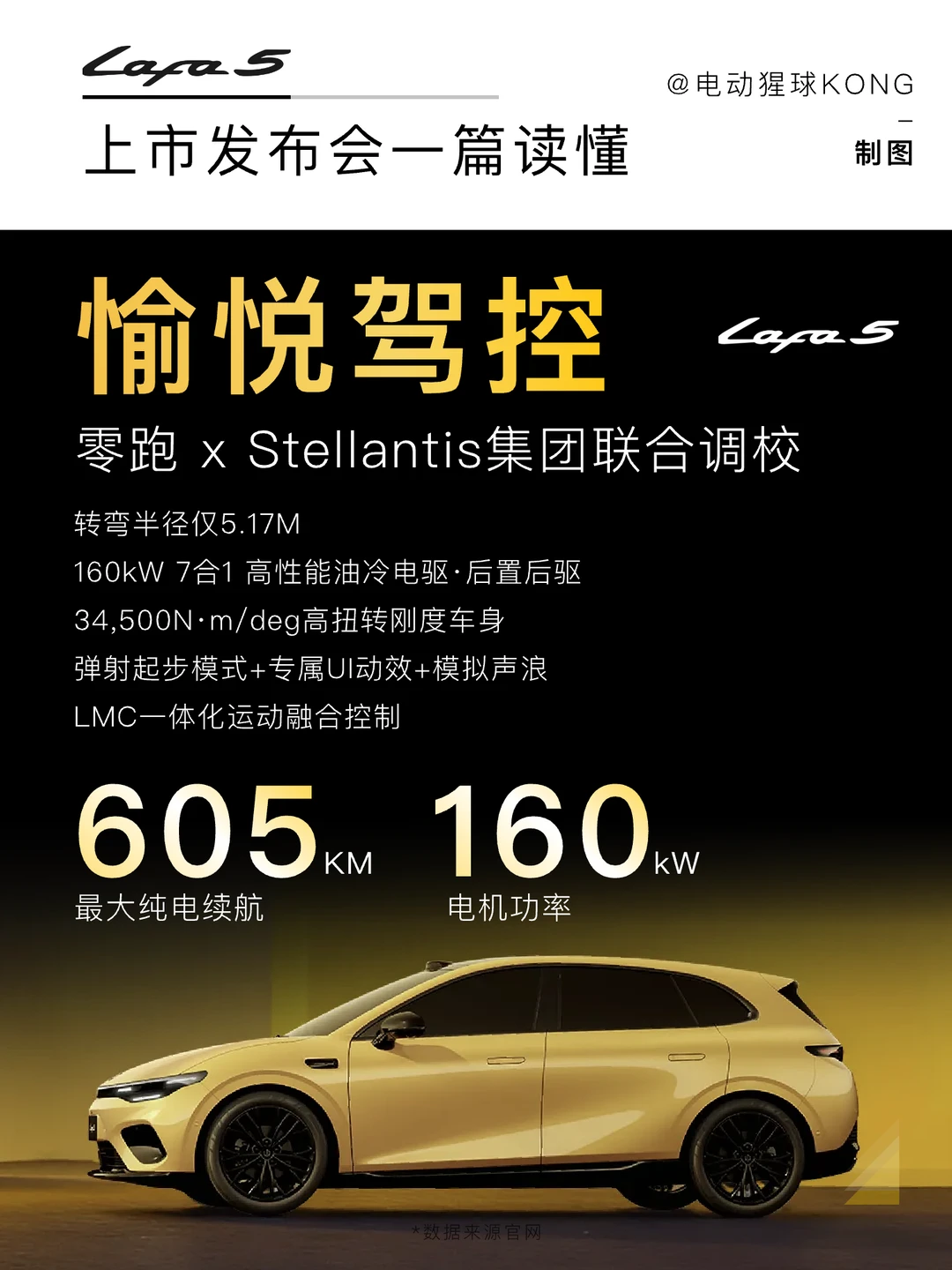 零跑Lafa5上市,值不值得买?花了2个小时总结,看这篇就够了: 1️⃣轿跑颜值 宽体车身溜背造型、短前后悬的轿跑姿态 全系无边框车门,开门瞬间玻璃微降,仪式感给够,尤其纯平侧窗非常高级 标配19英寸掠翼运动轮毂,颜值提升很大,同级还有在用16寸的 6种配色(车型专属色“风驰电掣”绝绝子)质感都比较年轻化! 6处辅助驾驶小蓝灯,家族化灯组,钢琴烤漆外饰,细节处理得不错 2️⃣愉悦驾控 中欧联合调校底盘,高速稳、低速顺,各种路况都适配 后置后驱,160kW大电机,零百加速6.4秒,支持弹射起步模式、专属UI动效,一脚加速情绪价值拉满 三种驾驶模式、自定义声浪,制动踏板感可调节,很个性化! 3️⃣越享座舱 环保座舱,5.54m²仿麂皮超纤绒、Nappa全粒面真皮拼接内饰,超80%软包覆盖率,质感没的说 86%超高得房率,带来宽敞前后排空间,1.02㎡超大全景天幕、电动遮阳帘,防晒又通透 4️⃣越级智能 激光雷达配端到端辅助驾驶,搭载8295P、8650旗舰双芯片,车机流畅度没的说 双AI大模型(DeepSeek、通义千问),支持方言识别、多轮对话、全场景可见即可说 14.6英寸2.5K中控屏、8.8英寸仪表,搭配Leap Sound 12扬声器,还有无麦K歌 5️⃣超长续航 至高605km纯电续航,日常通勤一周一充,跨城出行无压力 30%-80%快充最快仅需18分钟,喝杯咖啡的时间就能满电出发 0.256超低风阻系数,搭配AGS主动进气格栅,百公里电耗低至12.3kWh,续航更实在 6️⃣全维安全 34500N・m/deg高扭转刚度车身(豪车配置),77.5%高强钢占比,非常舍得给料 LMC一体化运动融合控制,起步不打滑,紧急避障更稳定 电池底盘一体化技术,电池热失控后48h不起火,满满的安全感 💡总的看下来,对这辆车最满意的是颜值,这个级别和预算,找一个好看的车很难得。零跑Lafa5“颜值、操控、舒适、智能、安全”全维度无短板,值得推荐~ 最后,手握10多个W,你会怎么选?