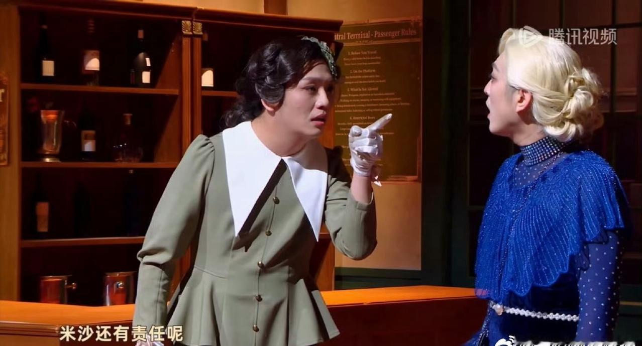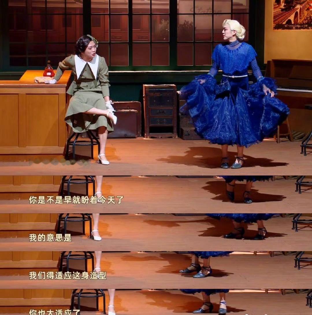 终于等到刘同穿绿裙登台,一瘸一拐说“这高跟鞋它不跟脚”,简短台词戳中笑点,他为舞台真下血本。