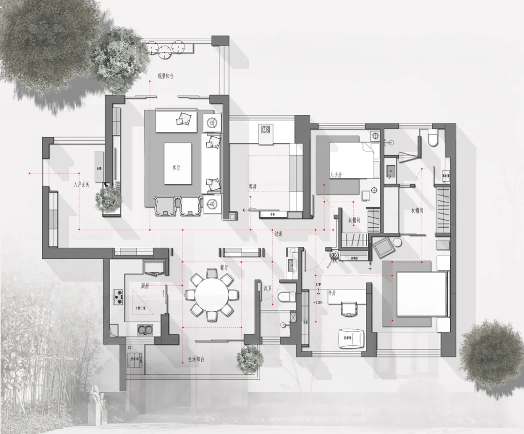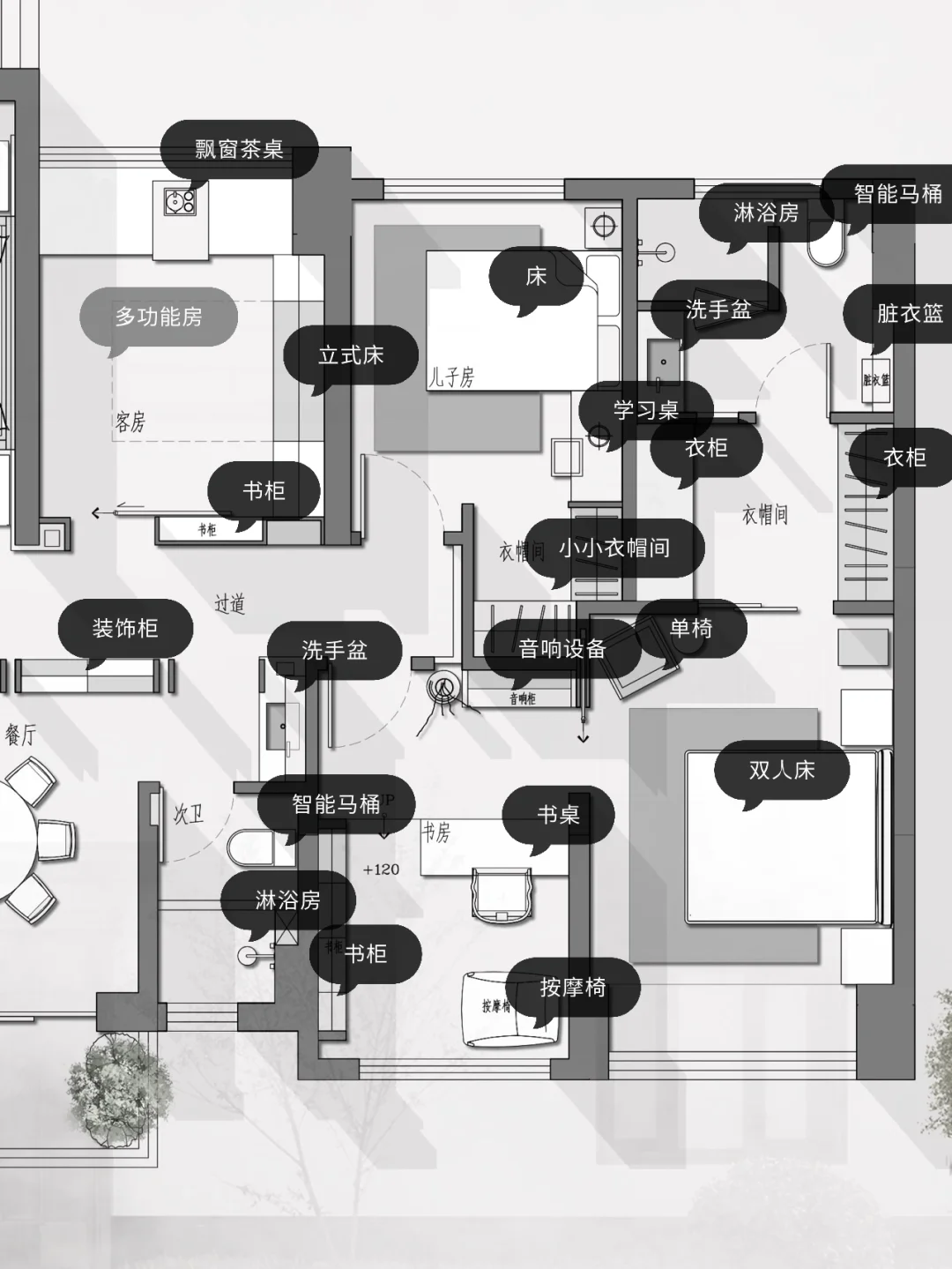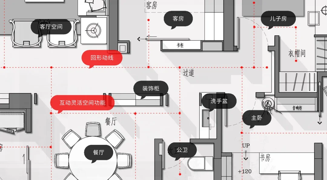 客户成员:一家三口 需要一个互动性强的客餐厅,一个多功能书房兼并客房功能、茶室功能,儿子房需要一个衣帽间,男主人需要一个独立的书房,可以躺在按摩椅上听音乐的空间,又能与主卧相连,女主人需要衣帽间。