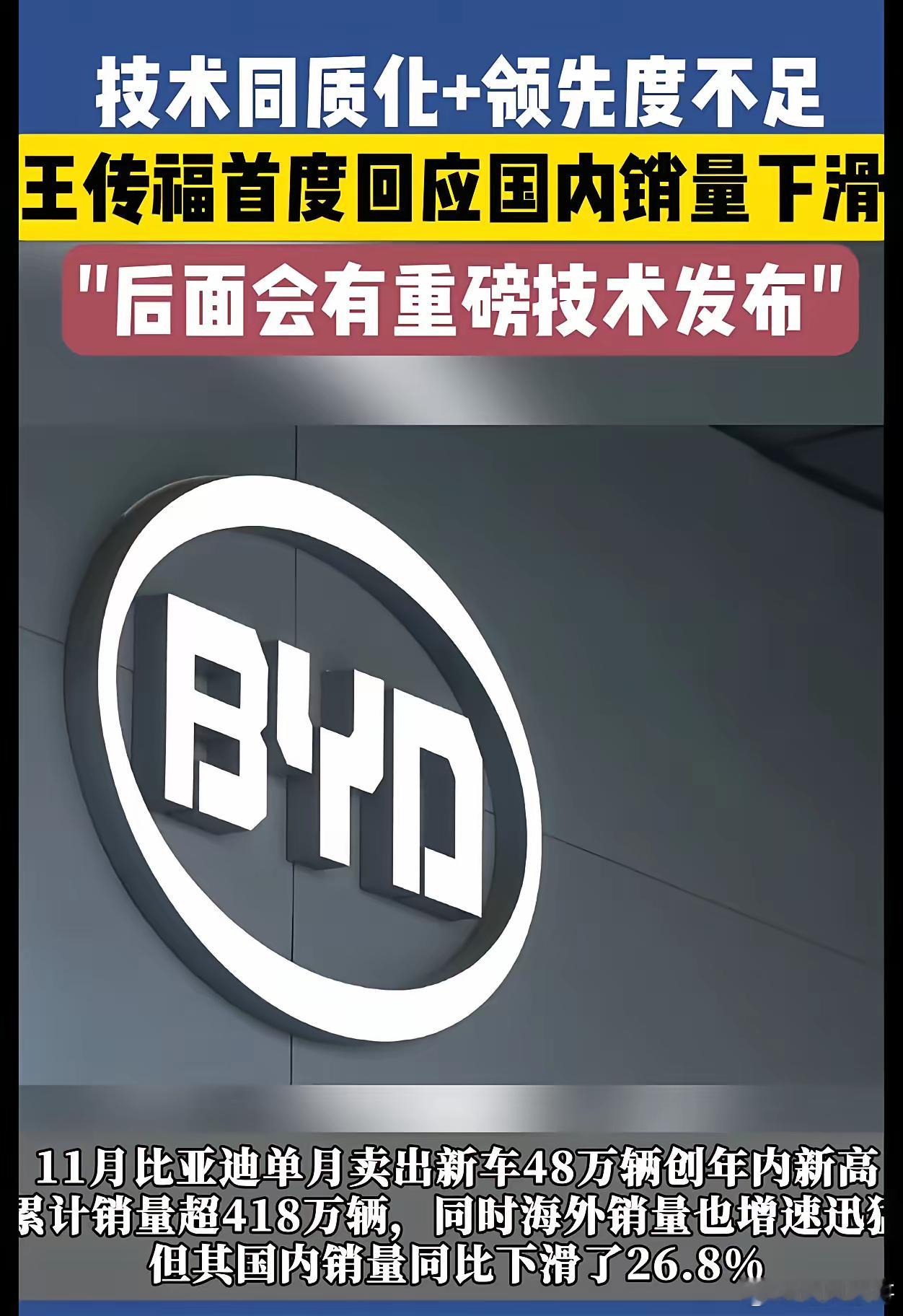 比亚迪董事长王传福勇敢面对比亚迪的现状,在今天比亚迪临时股东大会上,王传福首度公开回应公司国内销量连续7个月下滑的问题。他说:当前比亚迪的技术领先度不及前几年,技术成果的市场惊艳度有所下降,叠加行业同质化特征渐显,这一变化符合产品及技术发展的周期性规律。低温充电速度慢等用户需求痛点,也亟待通过技术突破予以解决。我之所以说目前技术不够领先,是因为后面还有重磅技术发布,但目前不方便透露。为应对当前市场挑战,比亚迪未来将聚焦四大核心动作破局:以12万工程师团队加码研发,落地第二代刀片电池、DM 6.0混动、兆瓦级闪充等技术,推动“天神之眼”智驾全系覆盖,自研车规级芯片打破供应链依赖。优化产品与渠道,砍掉25%冗余车型配置,推行库存熔断机制与实时返利政策,缓解经销商压力,提升产品性价比。加速全球化布局,推进欧洲、东南亚、北美海外工厂建设,推出区域特供车型,目标将海外市场占比提升至20%。同时升级国内产线智能化,落地无人生产模式与一体化压铸技术,通过生态合作与技术下放全面强化核心竞争力,对冲行业竞争与市场波动。