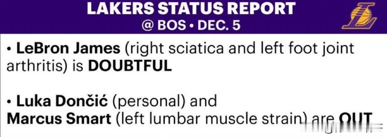 太给面子了,凯尔特人全员出战!!!湖人对阵凯尔特人伤病报告出炉! 北京时间12日5日,湖人客场对阵凯尔特人的比赛八点就要打响了,湖人和凯尔特人在凌晨公布了伤病报告,一起来看下吧。 湖人方面: 詹姆斯小概率出战,东契奇和斯玛特确定不打。 凯尔特人方面: 除塔图姆外,凯尔特人全员出战。 凯尔特人是不是太给面子了,昨天布朗还生病了,今天就好了,看来湖人确实是最好的队医了,湖人一来,百病消! 目前ESPN并不看好湖人,双方最近势头都很好,就看谁能把对方给终结了。 湖人赛程 湖人阵容名单 凯尔特人 湖人伤病 湖人 詹姆斯