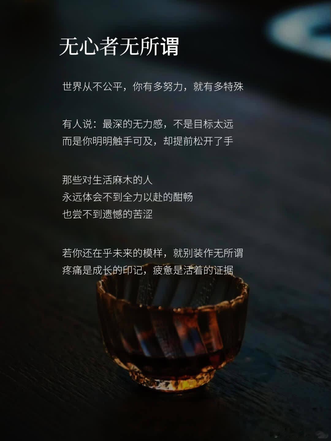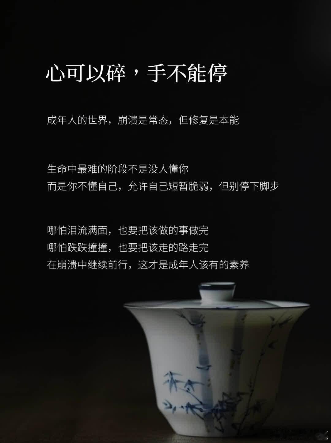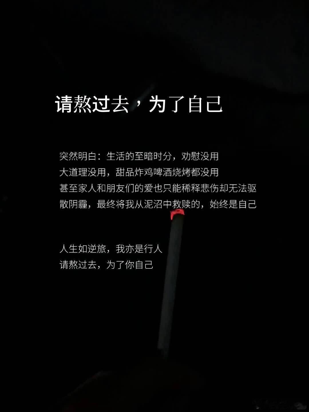 请熬过去,为了自己 突然明白:生活的至暗时分,劝慰没用 大道理没用,甜品炸鸡啤酒烧烤都没用 甚至家人和朋友们的爱也只能稀释悲伤却无法驱 散阴霾,最终将我从泥沼中救赎的,始终是自己 人生如逆旅,我亦是行人 请熬过去,为了你自己 1. 无心者无所谓 世界从不公平,你有多努力,就有多特殊 有人说:最深的无力感,不是目标太远 而是你明明触手可及,却提前松开了手 那些对生活麻木的人 永远体会不到全力以赴的酣畅 也尝不到遗憾的苦涩 若你还在乎未来的模样,就别装作无所谓 疼痛是成长的印记,疲惫是活着的证据 2.、心可以碎,手不能停 成年人的世界,崩溃是常态,但修复是本能 生命中最难的阶段不是没人懂你 而是你不懂自己 允许自己短暂脆弱,但别停下脚步 哪怕泪流满面,也要把该做的事做完 哪怕跌跌撞撞,也要把该走的路走完 在崩溃中继续前行,这才是成年人该有的素养 3.、坚持长期主义 这世上从没有一蹴而就的成功 所有光鲜背后都是笨拙的坚持 种一棵树最好的时间是十年前,其次是现在 别因为看不到即时回报就放弃 时间从不会辜负默默耕耘的人 你读过的书、熬过的夜、流过的汗 终会在某一天,让你站在曾经仰望的高度 4、好心态最重要 生活就像一面镜子,你皱眉它便阴沉 你微笑它便明亮 顺境时修炼能力,逆境时修炼心态 把“为什么是我”换成“这件事想教会我什么” 你会发现,苦难背后藏着礼物 不要慌,不要慌,太阳下山有月光 人生没有白走的路,你披星戴月的每一天 都在为未来的自己铺路 向前看,前路漫漫亦灿灿 抬头看,漫天星光甚浪漫 低头看,半路荆棘已过半 请熬过去,不要回头,前方有光,迟早变好