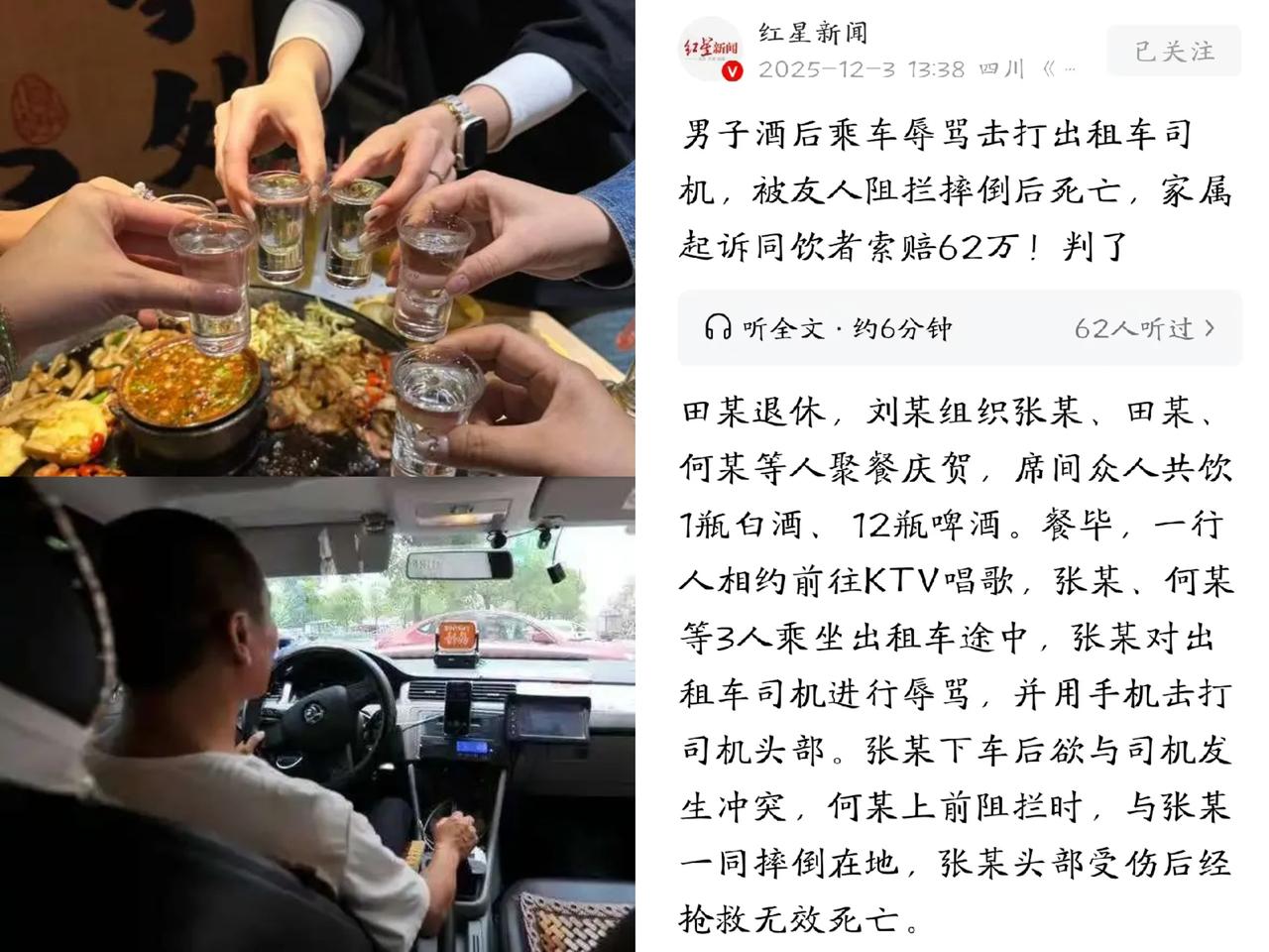 吉林,为庆祝好友退休,男子六人聚餐吃饭,喝了一瓶白酒,12瓶啤酒。酒局散后,又打车准备去KTV唱歌,谁知 其中一男子喝大了,到的目的地后不但不下车,还言语辱骂并用手机砸司机的头,好友赶紧出面阻拦,谁知两人双双摔倒,男子头部流血。 好友将其赶紧送往医院并垫付了医药费,可男子还是抢救无效死亡。家属不干了,将同饮者告上法庭,索赔62万,法院的判决亮了。 2024年9月,田某退休,好友刘某组织了六人的庆祝聚餐。大家兴致正高,一起喝了1瓶白酒加12瓶啤酒。 酒局散了还不过瘾,又约着去KTV续场。谁也没想到,这场开心的聚会,会以悲剧收场。 张某、刘某、何某三人同乘一辆出租车,到了KTV门口,刘某正扫码付车费,张某却突然不对劲了。 不仅赖在车里不下车,还张口就辱骂司机,非要让司机继续开。司机一头雾水追问去向,张某直接抄起手机就朝司机头上砸去。 司机没敢纠缠,赶紧下了车,可张某不依不饶,跟着下车后还想冲上去找事,嘴里骂骂咧咧没停。一旁的何某怕事情闹大,赶紧上前阻拦。 没成想拉扯间两人一起摔倒在地。何某脸朝下摔着没大碍,张某却是仰面倒地,头部瞬间流了不少血,直接站不起来了。 刘某当场就慌了,立刻打了120,出租车司机也报了警。急救车19点32分派出,11分钟后就到了现场,20点03分就把人送到了医院。 刘某和何某心里过意不去,跟着去了医院,何某还主动垫付了医药费。 可命运没给补救的机会,张某诊断出多发性大脑挫裂伤、创伤性急性硬膜下出血,治疗半个月后突然呼吸心跳骤停。 家属看着没希望,放弃了进一步抢救,之后还拒绝了解剖,直接把尸体火化了。死亡证明写得很清楚,直接死因就是脑挫裂伤。 按理说,这事明眼人都能看出个大概,可张某家属就是不接受,一口咬定同饮者有责任,把刘某、何某、田某全告了,索赔62万。这波操作,属实让人大跌眼镜。 但法院可不是看谁闹得凶就偏向谁,调取的监控把事情经过拍得明明白白。张某是主动动手打司机,下车后还执意挑事。 何某阻拦是为了阻止他侵害别人,完全是正当行为,根本没有故意让他摔倒的意思。 而且法律讲的是“过错责任”,《民法典》1165条早就说透了,没过错就不用担责。 聚餐时没人劝酒灌酒,张某喝酒后言行也都在自己控制范围内,何某阻拦合法,刘某及时叫救护车,同饮者做的已经够到位了。 张某家属还说送医地址错了导致延误,可拿不出任何证据证明延误和死亡有关。反观张某,作为完全民事行为能力人,自己主动挑事引发冲突。 摔倒受伤致死,全程都是自己的过激行为导致的,这就是《民法典》1173条说的“自身重大过错”。 法院最终驳回了家属的诉求,这个判决真的太公正了。很多人觉得“喝酒出事同饮者就得担责”,但这不是绝对的,得看有没有过错。 要是没劝酒、尽到了救助义务,凭什么要为别人的冲动买单? 现在有些家属,一旦出了悲剧就想找个“背锅的”,可法律不支持这种无理索赔。 情谊聚餐不是“连坐”的理由,同饮者有提醒照顾的义务,但没有替别人承担所有风险的责任。 更关键的是,张某家属拒绝解剖,等于放弃了查明真相的可能,现在又拿不出任何证据证明同饮者有过错,这样的索赔怎么可能得到支持? 成年人要为自己的行为负责,这不仅是道德要求,更是法律原则。 这场悲剧其实早就藏着预警:喝酒要懂分寸,遇事要控情绪。要是张某能克制一点,不主动挑事,何至于落得这般下场?要是家属能理性看待,也不会白费功夫起诉。 法律从来不会纵容无理取闹,也不会让无辜者背锅。这个判决不仅给了同饮者公道,更提醒所有人:聚会喝酒开心归开心,守住底线和分寸才最重要。 你觉得同饮者该担责吗?如果是你遇到这种情况,会怎么处理?