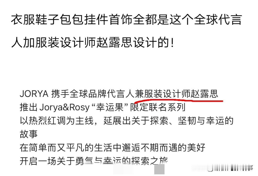 赵露思“少女千金风”设计:甜美元气里的精致感 赵露思操刀的JORYA联名系列,把“少女千金风”拿捏得恰到好处:甜美元素(碎花、水果印花)搭精致细节(小狗首饰、针织斗篷),既保留少女感的灵动,又有高端女装的质感。 这种风格适配日常与轻场合,甜而不腻、贵气不张扬,刚好戳中Z世代对“精致少女感”的审美,既满足穿搭的氛围感,也兼顾了实用性。