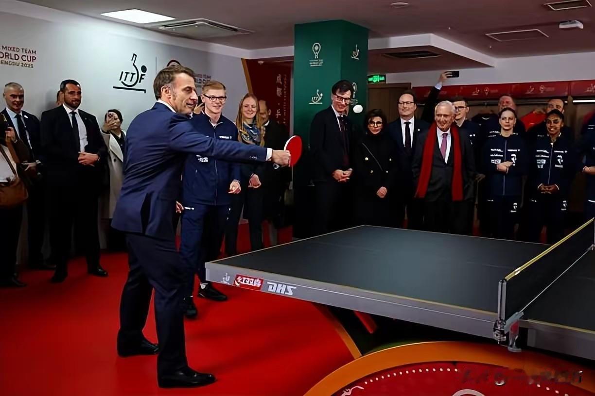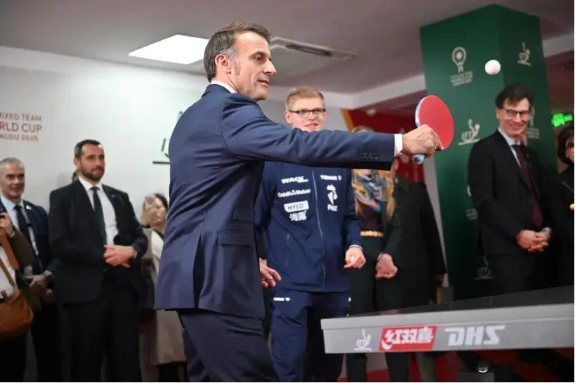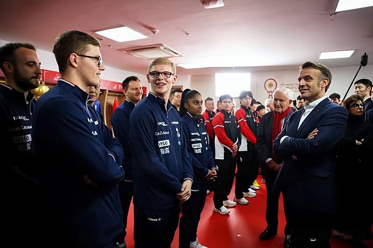 法国总统马克龙访问四川成都期间,来到四川省体育馆看望参加混团世界杯比赛的法国乒乓球运动员,亲切挥拍上阵,同王楚钦、林诗栋、孙颖莎、王曼昱等中国乒乓球运动员切磋球技,还展示了一下自己的反手技术。