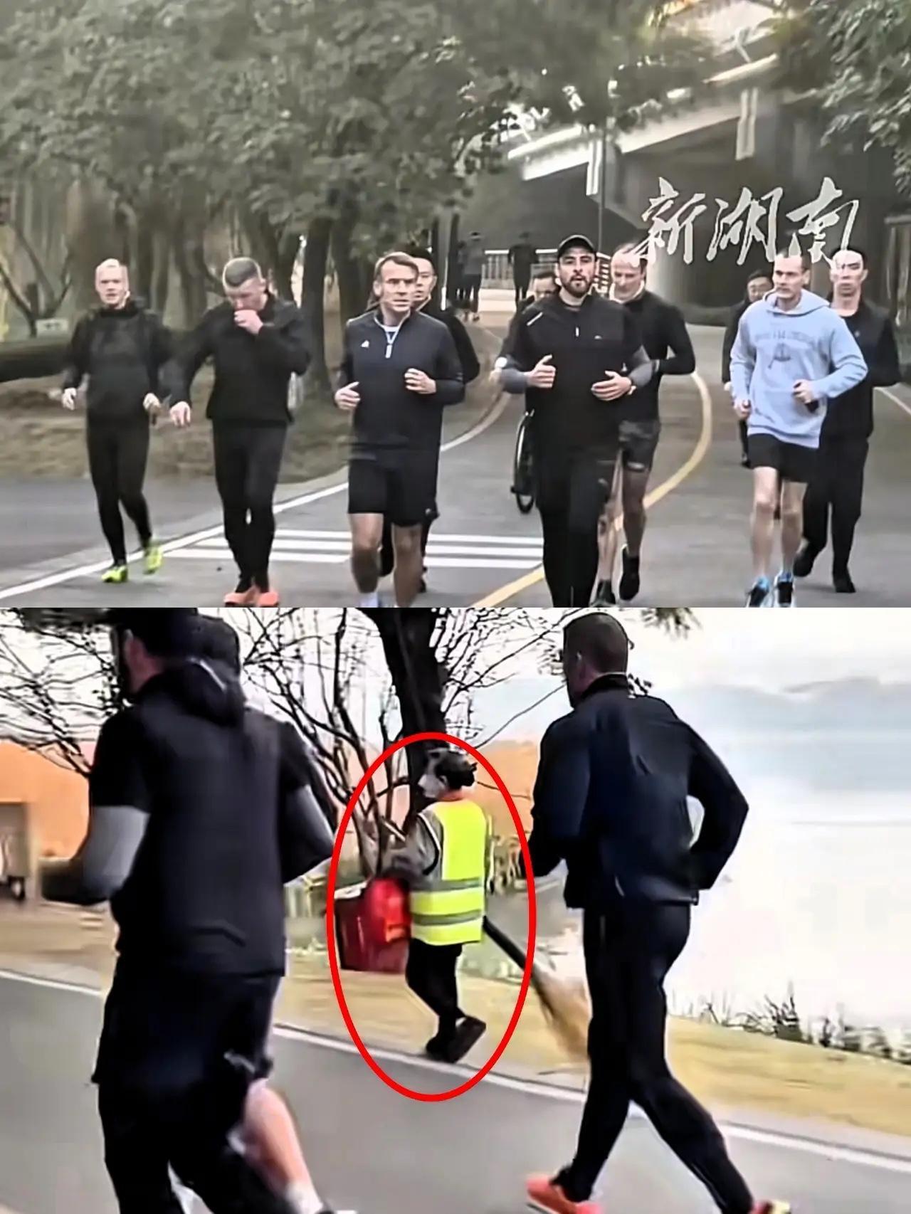 马克龙在成都锦城湖公园晨跑, 还热情跟路人挥手打招呼, 这场景乍一看挺吸睛,可真