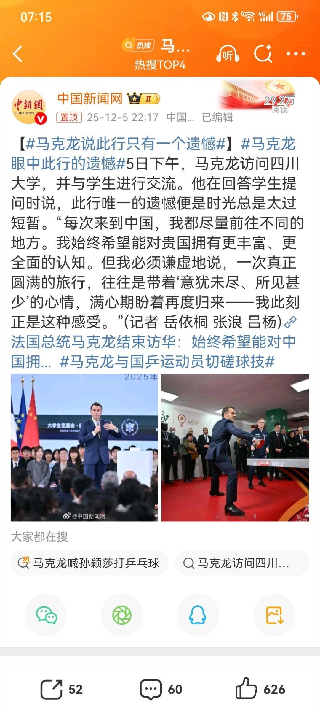 【马克龙说此行只有一个遗憾】马克龙眼中此行的遗憾8年前,马克龙以39岁之龄成为法国最年轻总统,2022年成功连任,此次访问四川大学时展现的青春活力令人印象深刻。他在与学生交流中坦言"此行唯一的遗憾便是时光太过短暂",这种"意犹未尽、所见甚少"的谦逊态度,恰恰体现了一位政治家的真诚与开放。从与国乒运动员切磋球技到看望大熊猫"圆梦",马克龙此行不仅深化了中法友谊,更以亲民姿态拉近了与中国人民的距离。他的活力与谦逊,正是中法关系持续向好的生动注脚。
