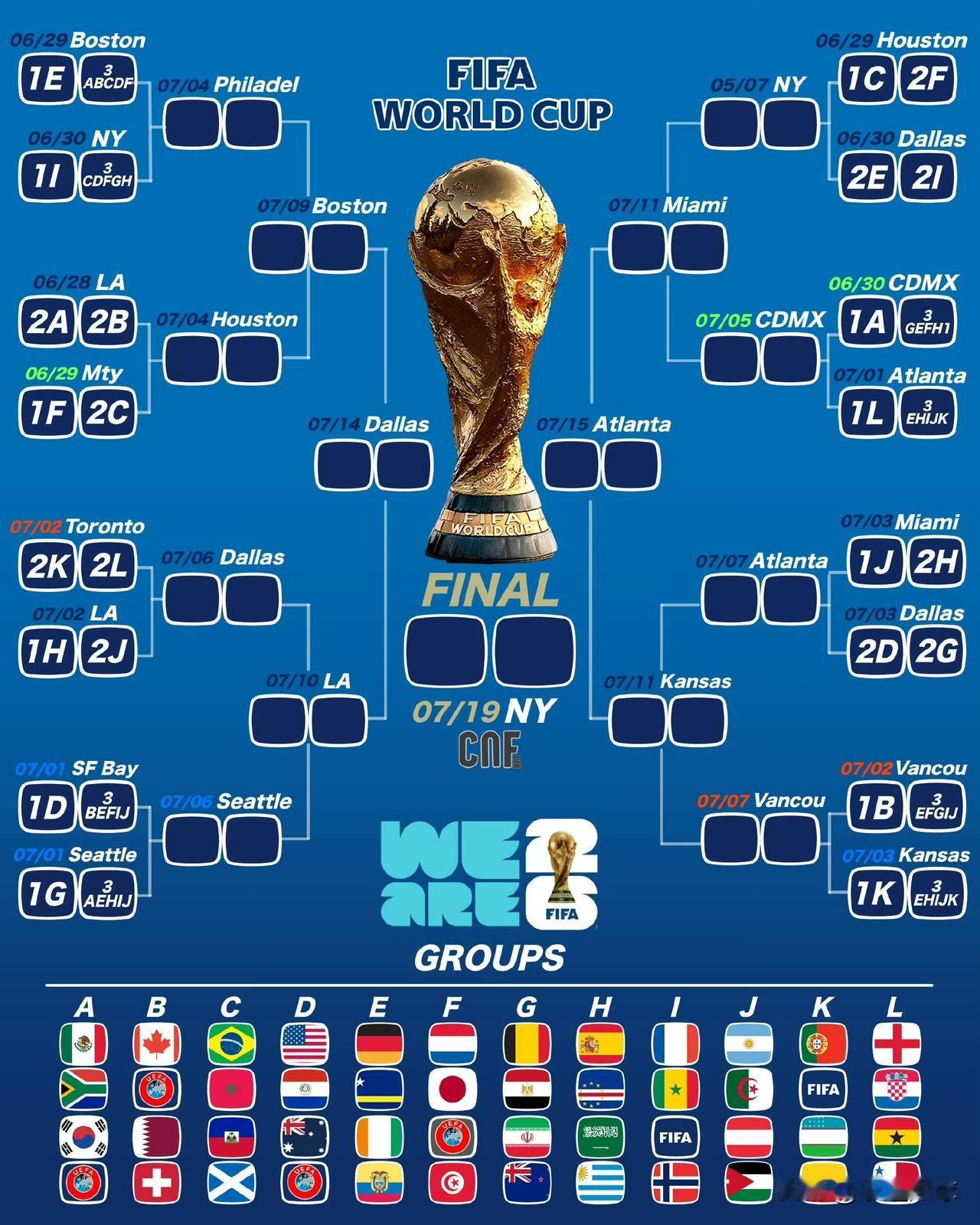 世界杯抽签仪式结束! 如果下面这8支国家队全部以小组第一的身份晋级,那么,2026年FIFA世界杯的四分之一决赛可能是这样的: • 法国对阵荷兰 • 西班牙对阵比利时 • 巴西对阵英格兰 • 阿根廷对阵葡萄牙 如果阿根廷和葡萄牙都赢得各自的世界杯小组第一,并顺利通过32强赛和16强赛,梅西和c罗将在7月11日于堪萨斯城进行的四分之一决赛中碰面。 上述条件其实不算太苛刻,FIFA肯定会看到这场世纪大战的“超级商机”。
