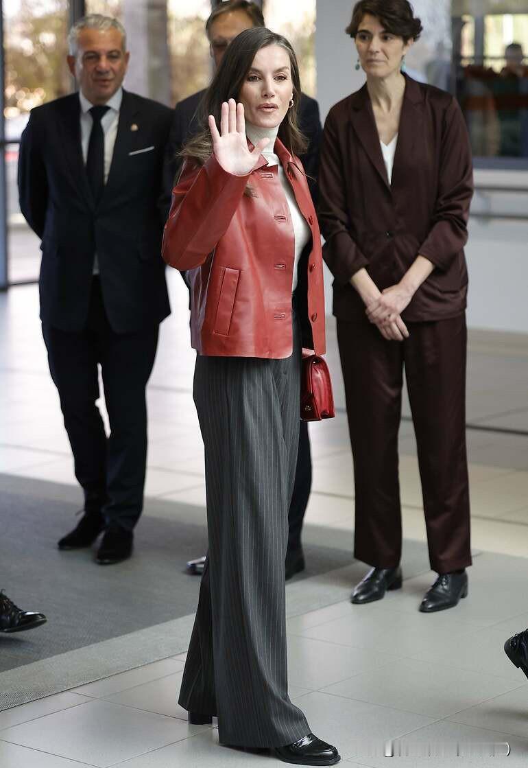 莱蒂齐亚王后以名誉主席身份,出席皇家残疾人理事会会议!本土品牌Mango的红色皮质上衣,搭配了条纹西装裤,再搭配红色系手包,不出彩也不出错吧!