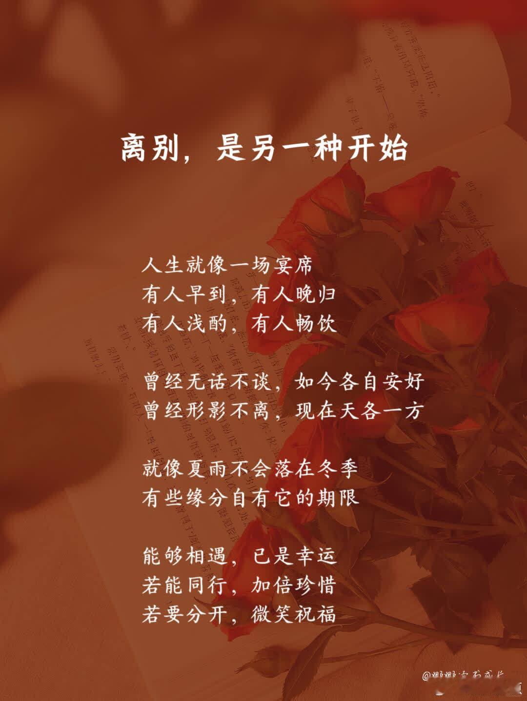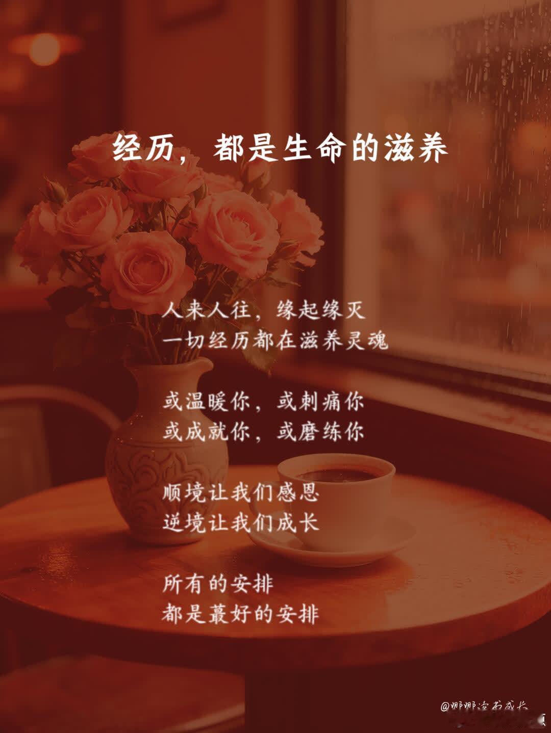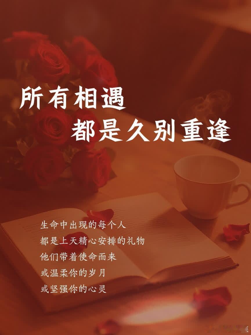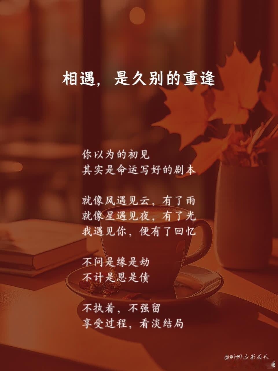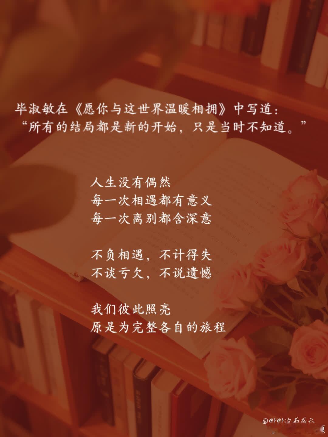 人生没有相欠,只有彼此照亮 相遇,是久别的重逢 你以为的初见 其实是命运写好的剧本 就像风遇见云,有了雨 就像星遇见夜,有了光 我遇见你,便有了回忆 不问是缘是劫 不计是恩是债 不执着,不强留 享受过程,看淡结局 ✨ 离别,是另一种开始 人生就像一场宴席 有人早到,有人晚归 有人浅酌,有人畅饮 曾经无话不谈,如今各自安好 曾经形影不离,现在天各一方 就像夏雨不会落在冬季 有些缘分自有它的期限 能够相遇,已是幸运 若能同行,加倍珍惜 若要分开,微笑祝福 ✨ 经历,都是生命的滋养 人来人往,缘起缘灭 一切经历都在滋养灵魂 或温暖你,或刺痛你 或成就你,或磨练你 顺境让我们感恩 逆境让我们成长 所有的安排 都是蕞好的安排 🌿 毕淑敏在《愿你与这世界温暖相拥》中写道: “所有的结局都是新的开始,只是当时不知道。” 人生没有偶然 每一次相遇都有意义 每一次离别都含深意 不负相遇,不计得失 不谈亏欠,不说遗憾 我们彼此照亮 原是为完整各自的旅程✨
