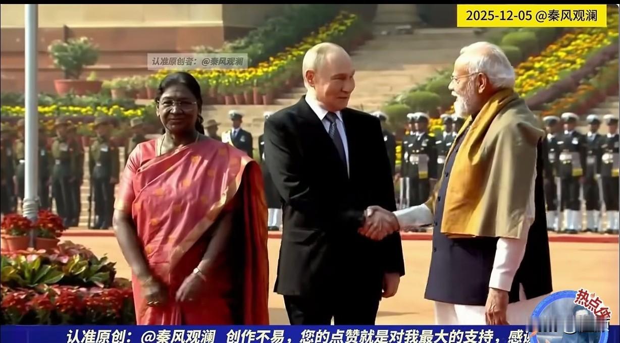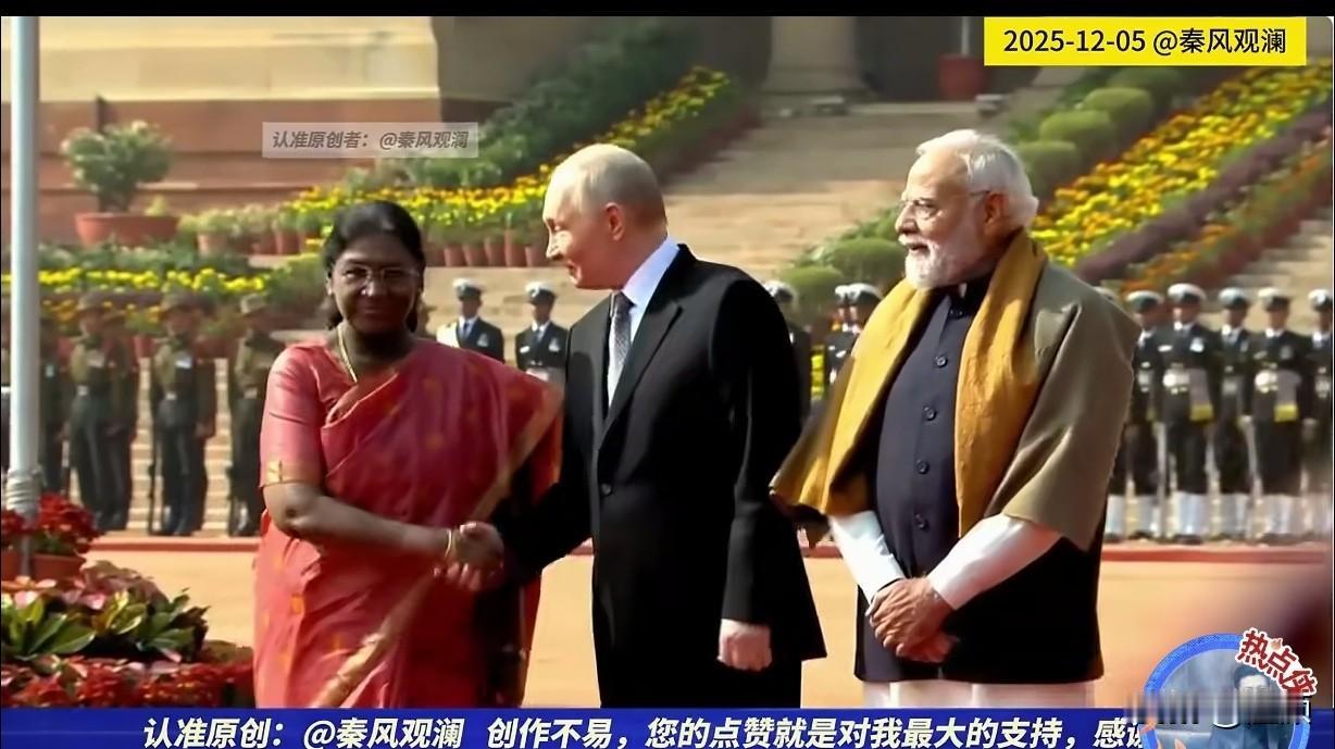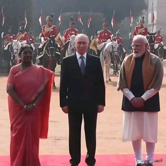 莫迪和印度女总统迎普京,21发礼炮红毯骏马礼兵齐上阵……开始以为是莫迪携夫人呢,其实人家是印度的女总统。