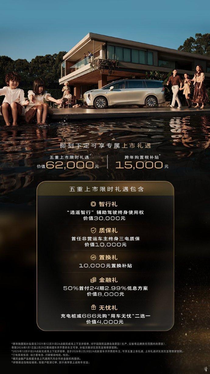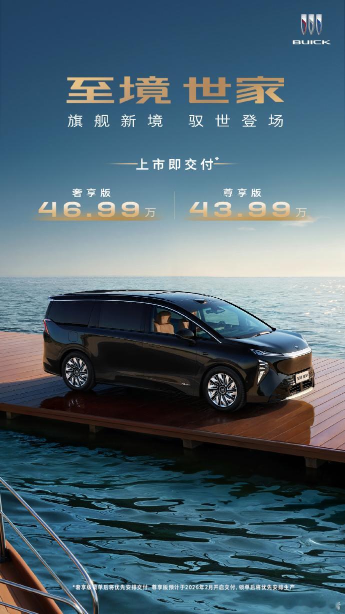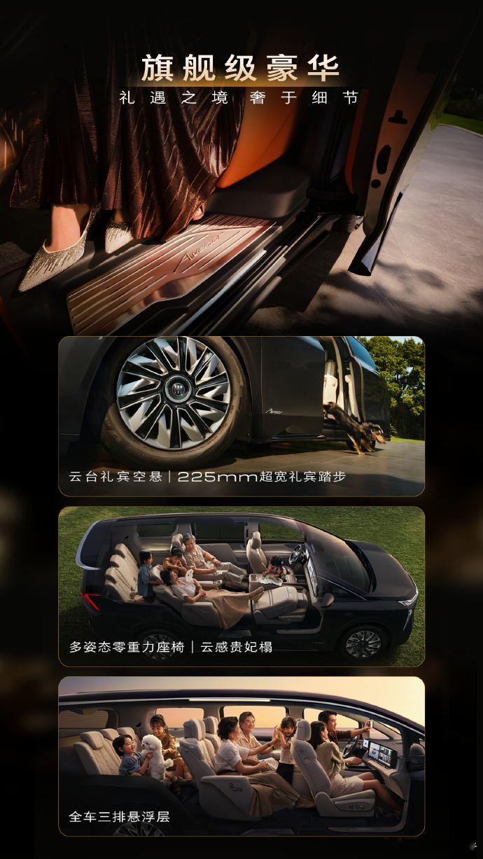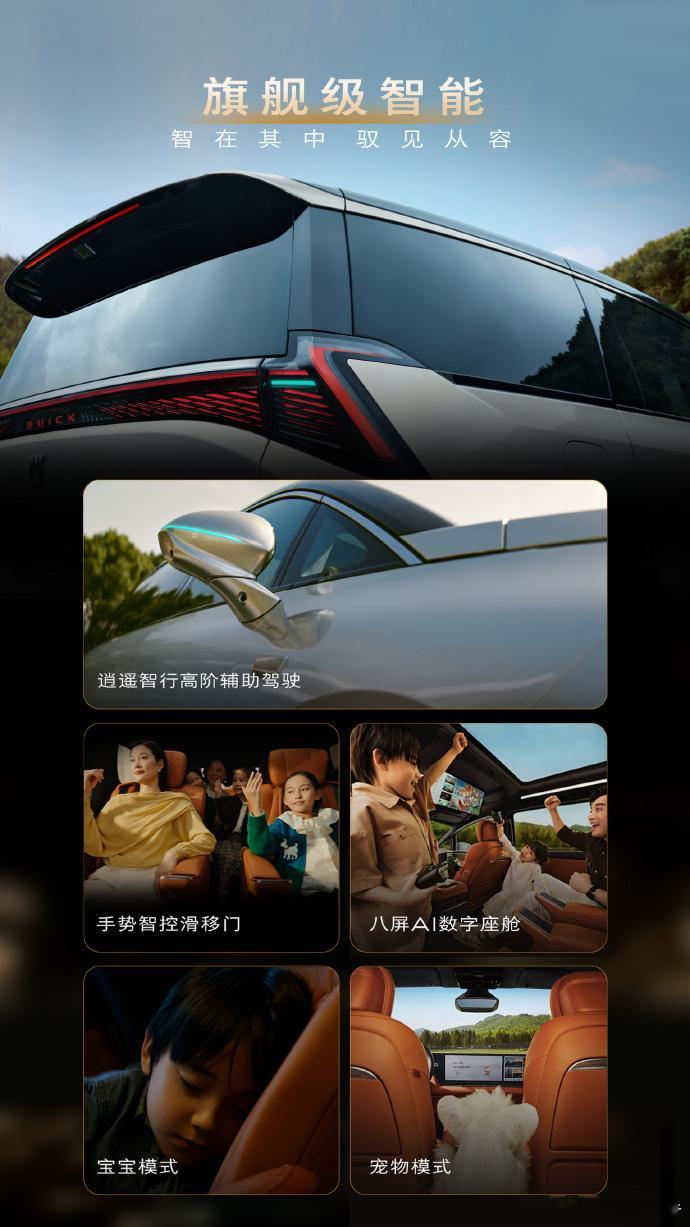 43.99万起别克世家上市即交付12月5日,别克至境世家正式上市,新车共推出款车型,售价区间为43.99万元起。车身尺寸方面,长宽高分别为5260/2000(2023)/1820(1835)mm,轴距为3160mm。内饰方面,别克至境世家中控台采用三联屏布局,由10.25英寸仪表屏、16.3英寸中控屏、16.3英寸副驾屏组成,车顶还配备21英寸4K后舱多媒体智慧屏,搭载高通最新一代SA8775P芯片。此外,该车还将配备50英寸全景AR-HUD抬头显示以及二排两个5.5英寸智慧移动管家屏,可控制二排座椅、空调、冰箱,支持小憩模式。辅助驾驶方面,至境世家搭载别克全新“逍遥智行”高阶辅助驾驶系统,依托Momenta R6飞轮大模型算法和强化学习能力,辅以包括1个激光雷达、3个毫米波雷达、12个超声波雷达以及11个高清摄像头等加持,让其拥有“无断点”城市NOA领航辅助。动力方面,别克至境世家先期搭载1.5T插电混动系统,并提供单电机前驱和双电机四驱可选。其中1.5T发动机最大功率为132千瓦,前电机最大功率为200千瓦,后电机最大功率130千瓦。匹配磷酸铁锂电池,电池容量为40.9千瓦时,拥有224km纯电续航以及1320km综合续航,0-100km/h加速仅需5.8秒。别克世家内能停一辆车别克至境世家别墅级新能源旗舰MPV
