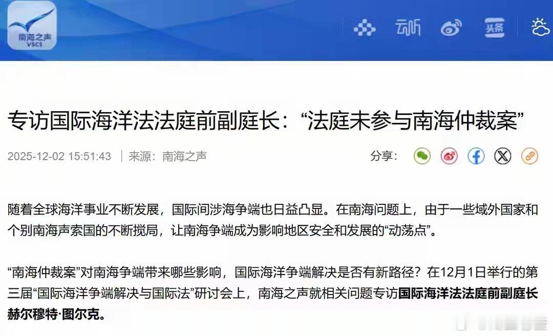 菲律宾这下尴尬了!国际海洋法法庭:“法庭未参与南海仲裁案”!这下可好,菲律宾和美国精心编排的“法律大戏”,居然被自己人捅破了窗户纸。12月1日那场关于海洋争端解决的研讨会上,前国际海洋法法庭副庭长赫尔穆特·图尔克一句话,就把整个仲裁案的“专业外衣”扒得干干净净。他老人家没有拐弯抹角,当场就挑明:那个当年被炒得沸沸扬扬的南海仲裁案,真正的国际海洋法法庭(ITLOS)压根没参与,完全不是他们系统里的案子。这话的含金量大得惊人,相当于是三甲医院副院长站出来说:“那个号称是我们专家做的手术?对不起,我们医院没有记录,也没有那号专家。”意思就是——这仲裁案的整个法理来源都不算数,根基都站不住。既然正规军压根不在场,那当年被包装得像模像样的“国际仲裁庭”,到底是些什么人拼出来的?顺着图尔克的说法往回看就明白了。那所谓的仲裁庭,根本不是什么固定存在的国际司法机构,它完全是个临时拼出来的“法律外包队”,最要命的是,这个“外包队”的核心人员,居然是由当年的国际海洋法法庭庭长柳井俊二指定的。这人如果只看名字,你会以为就是个日本籍法官,但要是把简历翻一翻,就能发现问题很大——他除了是法官外,还是日本安倍政府安保法制恳谈会的会长,换句话说,他不仅政治立场明确,而且还刚好站在当年日本遏制中国的政策前线。你让这么一个紧跟安倍政府安保战略的人,跑来指定负责审理一个针对中国的仲裁案的核心成员,这不就像让对方球队的球员兼任裁判一样?程序从一开始就歪了,结果能不离谱吗?于是南沙太平岛这种现实中明显是能长期居住的自然岛,被这些临时拼来的“裁判”硬说成是“岩礁”,一个50万平方米、有淡水、有植被、有驻民的岛屿,被他们写成“不能维持人类生活”,这要是让中学生看地理书,都知道不通。他们搞这套,就是为了迎合当时菲律宾的诉求:只要把岛判成礁,那就不能划专属经济区,刚好贴合菲律宾的政治目的,这不叫法律裁判,叫“按需定制”。更加讽刺的是,这场被宣传成“维护《联合国海洋法公约》权威”的仲裁闹剧背后,推得最卖力的美国,自己压根不是公约成员国,连群都没进,却天天举着群规去要求别人。中国其实在1996年就按公约规定做了排除声明,本来就不接受这种强制仲裁。别人硬拉你来评理,这放哪都是无效的,仲裁结果一出,当时美国和菲律宾还以为捡到宝,准备满世界贴“小字报”,想在舆论上给中国来个“沉重打击”。可现实很快就告诉他们一件事:靠一张纸,什么也改变不了,最早意识到这点的,居然是推动仲裁最积极的菲律宾,菲律宾前总统杜特尔特甚至当着媒体说,那份裁决不过就是“一张废纸”,他直接丢垃圾桶里了。他不是情绪化,而是看明白了真正的现实:哪怕你拿着所谓的“胜诉状”,南海的局面一丁点都没变,中国控制的岛礁纹丝不动,中国的行动照样进行,压力没减,反而更多。这场仲裁对菲律宾来说不仅没带来好处,还让自己在地区关系中更尴尬,你对着世界宣称赢了,但实际海上一寸没拿到,和中国的关系反而因此恶化,经济合作也受影响,台面上看是“法律胜利”,实际上却是把自己推到了更不利的位置。国际上也没给美国和菲律宾“站台”。美国原本想组织全球舆论施压,把“仲裁结果必须执行”搞成国际共识。结果不仅没成,反倒形成了反效果——超过90个国家公开支持中国立场,各种国际组织、政党声明超过230个,基本上把所谓的“孤立中国”变成了美国和菲律宾的自我孤立。最硬气的例子就是柬埔寨。柬埔寨首相洪森当着美国国务卿克里的面,说这种仲裁就是一场政治阴谋,不仅无助于解决问题,还会搞乱整个地区。他甚至直接反问美国:凭什么你们不加入公约,却要用公约的条款来要求别人?这话放在外交场合里,那是真刀真枪、不留情面,东盟国家自己都不愿意被美国拖进这场闹剧,怎么可能配合美国给中国施压?俄罗斯也看得很透,俄罗斯驻华大使杰尼索夫明确说:南海的紧张根源不是领土纠纷本身,而是域外国家跑来搅局,对于这种主权相关的争端,指望第三方强行介入,不可能有结果,真正有效的方式只有当事国谈判解决,他这话其实就是把美国的“外来操盘”直接点破。把这些态度拼起来,就能看出一个趋势:仲裁闹剧只在美国和菲律宾的宣传里看上去气势汹汹,在现实世界里根本没有多少国家买账,因为大家都知道,这类问题靠强行法律包装是解决不了的。如今再回头看这九年,菲律宾能从仲裁案里得到的利益几乎是零,它跟着美国走,以为能借法律推进战略目标,结果换来的却是自己在地缘政治里的被动地位、与中国关系的紧张,以及东盟内部的分裂。最关键的是,现实根本不会因为一张仲裁书发生改变,中国在南海的存在稳如磐石,美国的军事动作反倒让地区局势更紧张,菲律宾既没得到海域,也没得到安全,连所谓国际支持也没有真正落到实处。而就在这种现实已经证明仲裁“失灵”的背景下,如今连当初法律体系内部的大人物——图尔克这样的权威人士,都公开站出来指出仲裁庭的程序问题,等于在最核心的位置上对这场仲裁做了终极评估:程序有瑕疵、主体不合法、裁决无效、结果不可执行。那些至今还想拿这张纸当挡箭牌、当筹码的人,现在恐怕只能自己照照镜子,因为连“系统内部人”都把真相摆在台面上了,再继续炒作,只