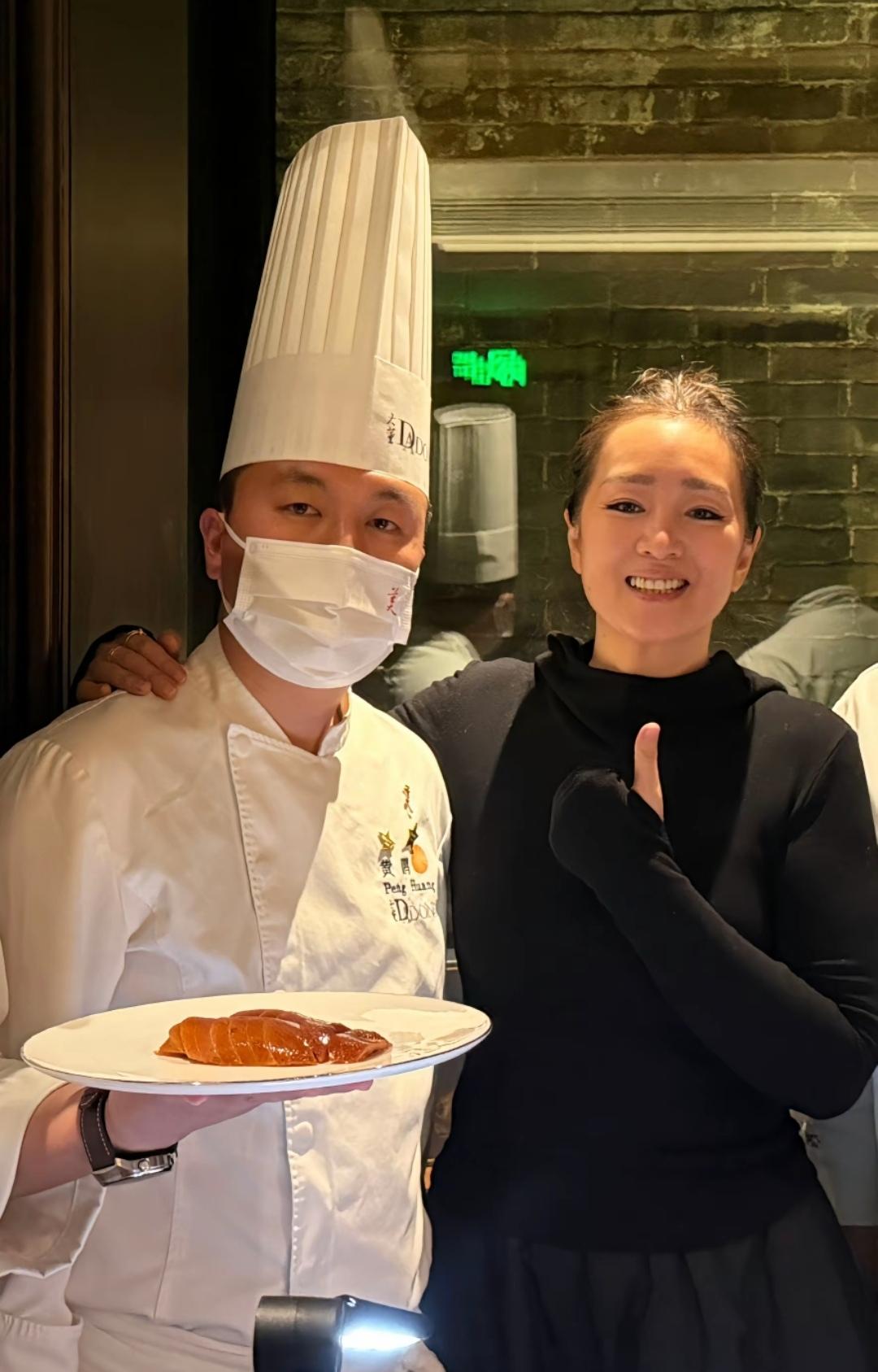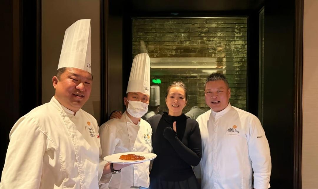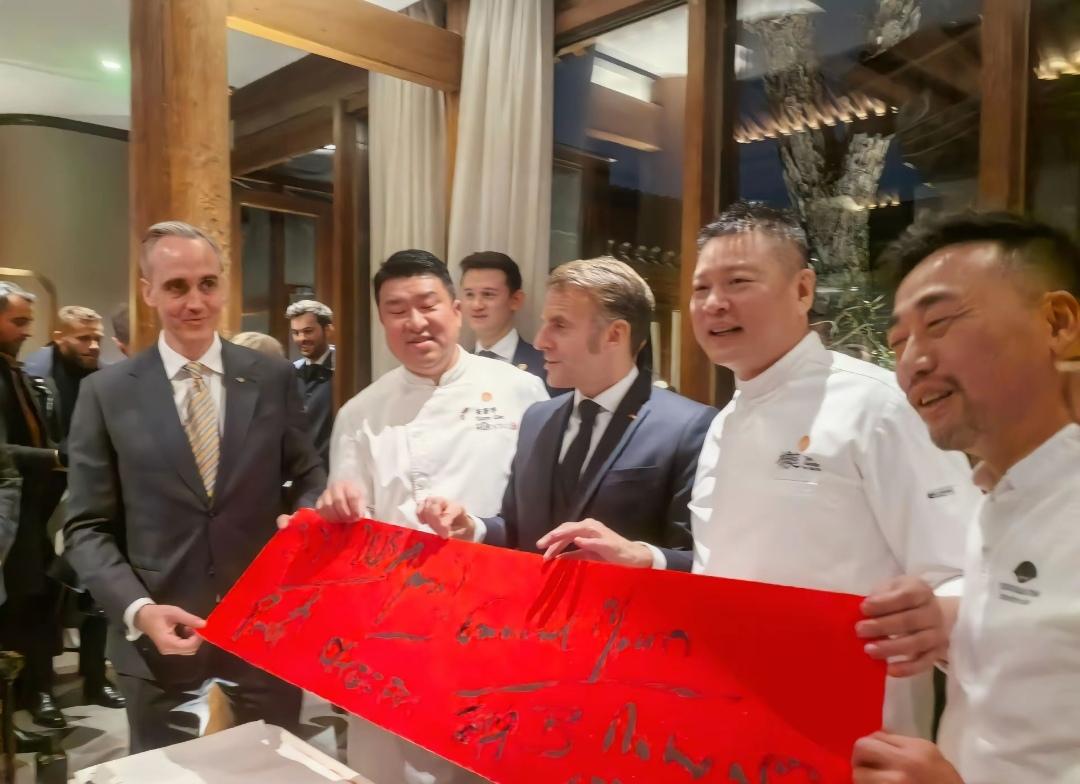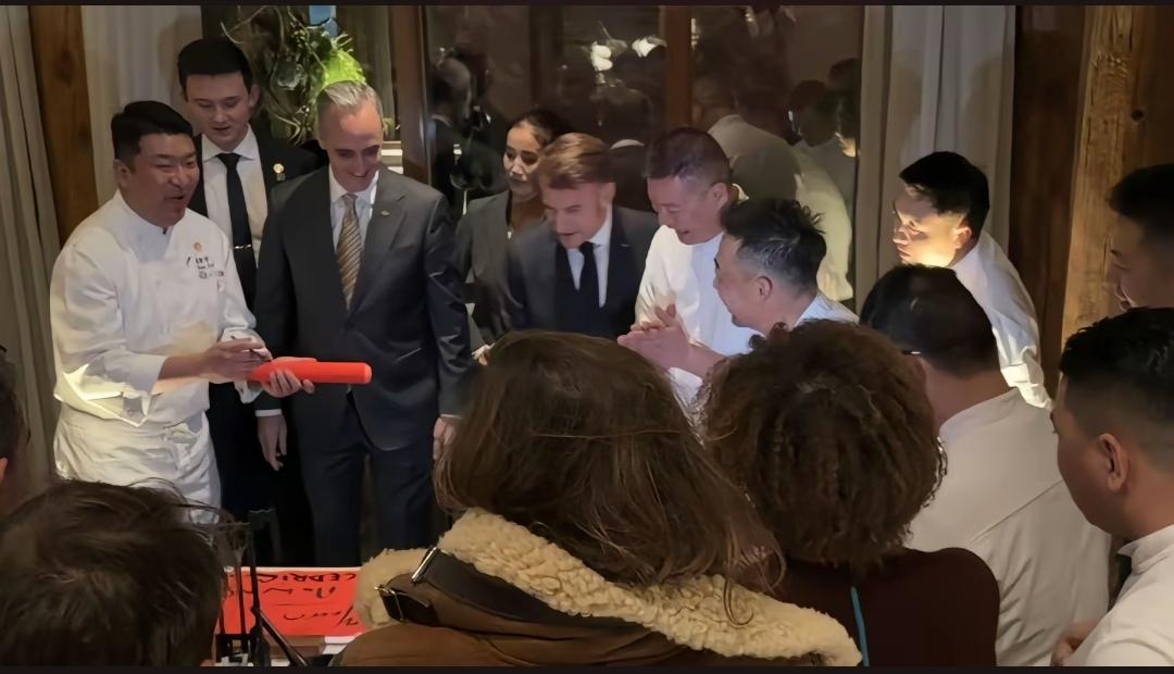 马克龙和布里吉特在酒店内,与厨师们热情互动,在吃饭前,有一个写毛笔字环节,送给夫妇俩毛笔字,马克龙也写了毛笔字,和厨师们一起合影留念。 马克龙夫妇还吃到了烤鸭,由酒店大厨专门片鸭,这位大厨感到很荣幸能有这个机会。 值得注意的是,巩俐也在现场,她和片鸭师傅热情合影。