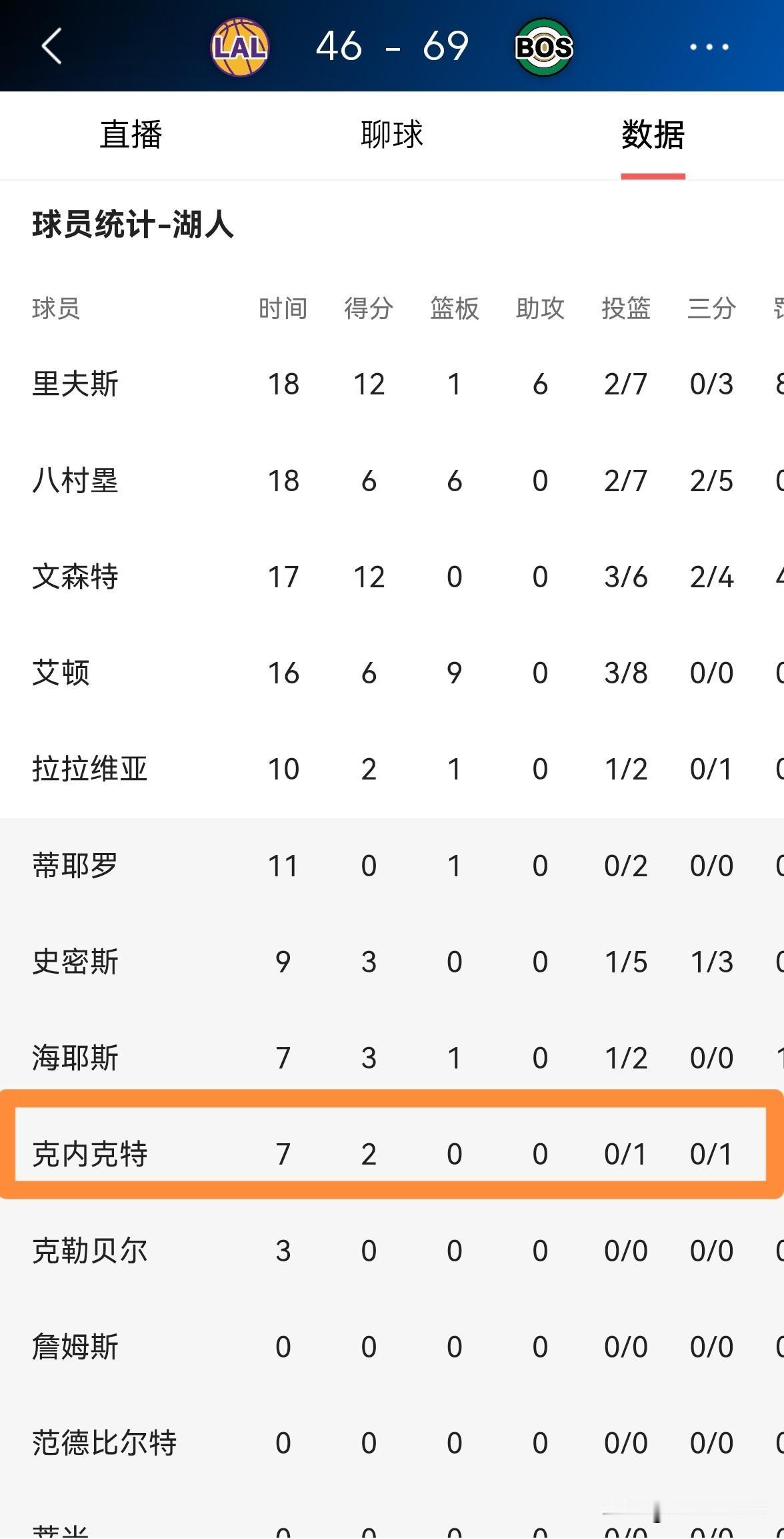 湖人超级新星克内克特距离被交易已经越来越近了!在今天进行的湖人和凯尔特人的上半场比赛中,湖人主帅雷迪克在人手不足的情况下给了克内克特7分钟的上场时间,可是克内克特仅仅依靠罚球得到2分,他的场上正负值为-13。 实事求是的说,克内克特最大的问题在于防守端,他的单防能力真是太差了,这不仅让他逐渐跌出了球队的常规轮换,而且距离被交易已经越来越近了。
