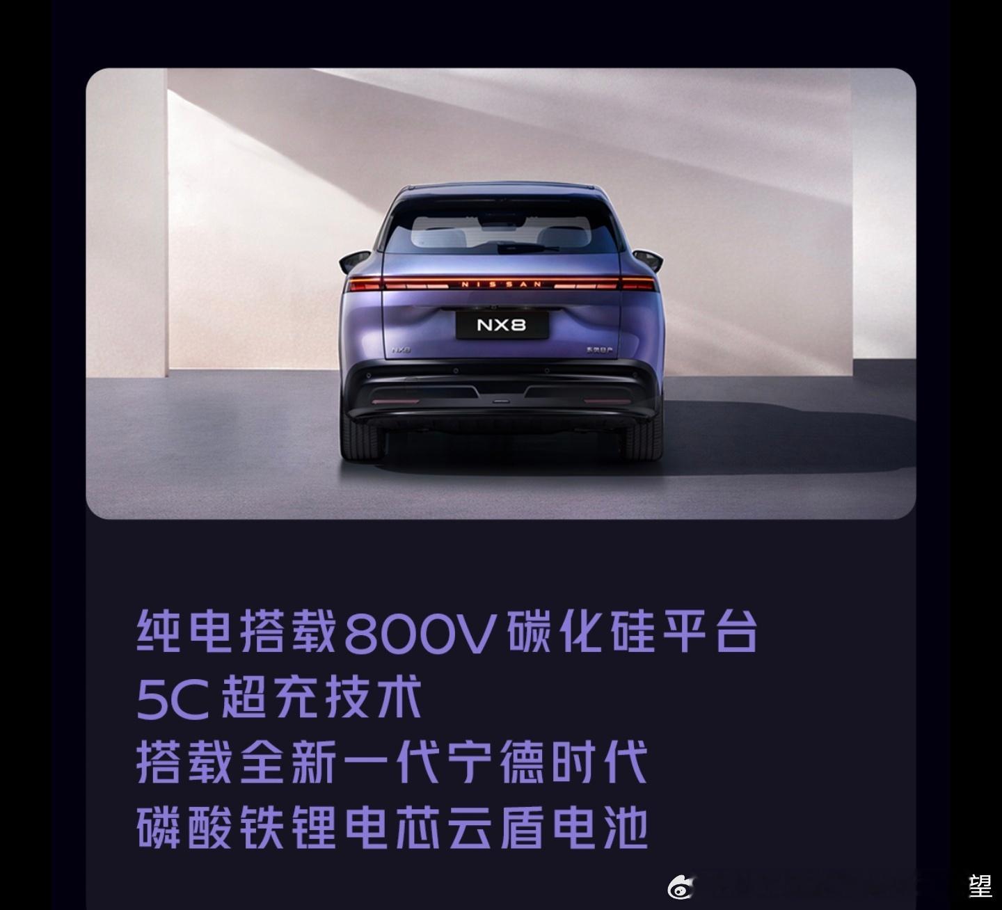 东风日产换了中国团队主导效率提升很大啊。新品接连不断。看来是要和嘟嘟嘟对台戏唱到底了N7把 嘟嘟嘟N7夺舍了现在又来N8 还好是NX84870车长+2917轴距宁德时代800v 5c 明年上半年上明年整个纯电市场恐怕都要主打5c快充东风日产这678小连招一套一套的 不会以后每个月新能源能卖3万辆了吧NX8东风日产中大型新能源SUV