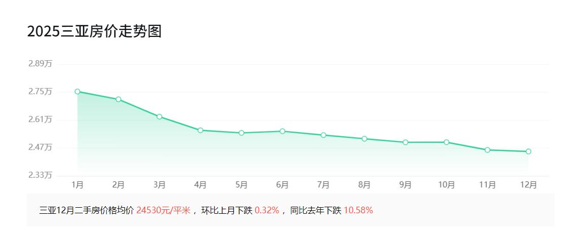 2025年1月,三亚房价均价27550元; 2025年2月,三亚房价均价27159元; 2025年3月,三亚房价均价26282元; 2025年4月,三亚房价均价25596元; 2025年5月,三亚房价均价25467元; 2025年6月,三亚房价均价25550元; 2025年7月,三亚房价均价25355元; 2025年8月,三亚房价均价25171元; 2025年9月,三亚房价均价24993元; 2025年10月,三亚房价均价24997元; 2025年11月,三亚房价均价24608元。 整体来看,三亚房价2025年期间略有下降。漫心r认为,当前三亚房市仍处于价格调整阶段,房价已逐步回调至2017年前后的水平,一定程度上反映出前期泡沫的挤出。从全国范围观察,当前房价已基本经历了一轮较为充分的调整,整体泡沫明显收缩。 对于三亚房价未来走势,漫心r不作具体预测,但可以明确的是,在“房住不炒”政策持续作用下,房地产将逐步回归商品属性,价格将遵循供需关系的基本逻辑。长期来看,房价会伴随经济发展稳步波动,难以再现过去大幅波动的行情。当然,在均价的基础上,房价肯定也不一样,品质好的房子价格自然也贵。