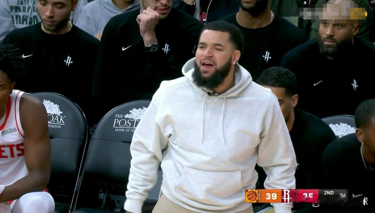 火箭当家控卫范弗里特真是太爱抢戏了!在今天火箭主场迎战太阳的比赛中,当时比赛进行到了第二节的8分16秒,杜兰特在一次进攻回合中持球强杀篮下完成了一记气势如虹的双手暴扣,帮助球队将场上分差缩小到了只有4分,这下可把替补席上的范弗里特给兴奋坏了,只见范弗里特在场下又蹦又跳的激情庆祝,导致全场的焦点都转移到了他的身上,范弗里特这是在明目张胆的抢戏。
