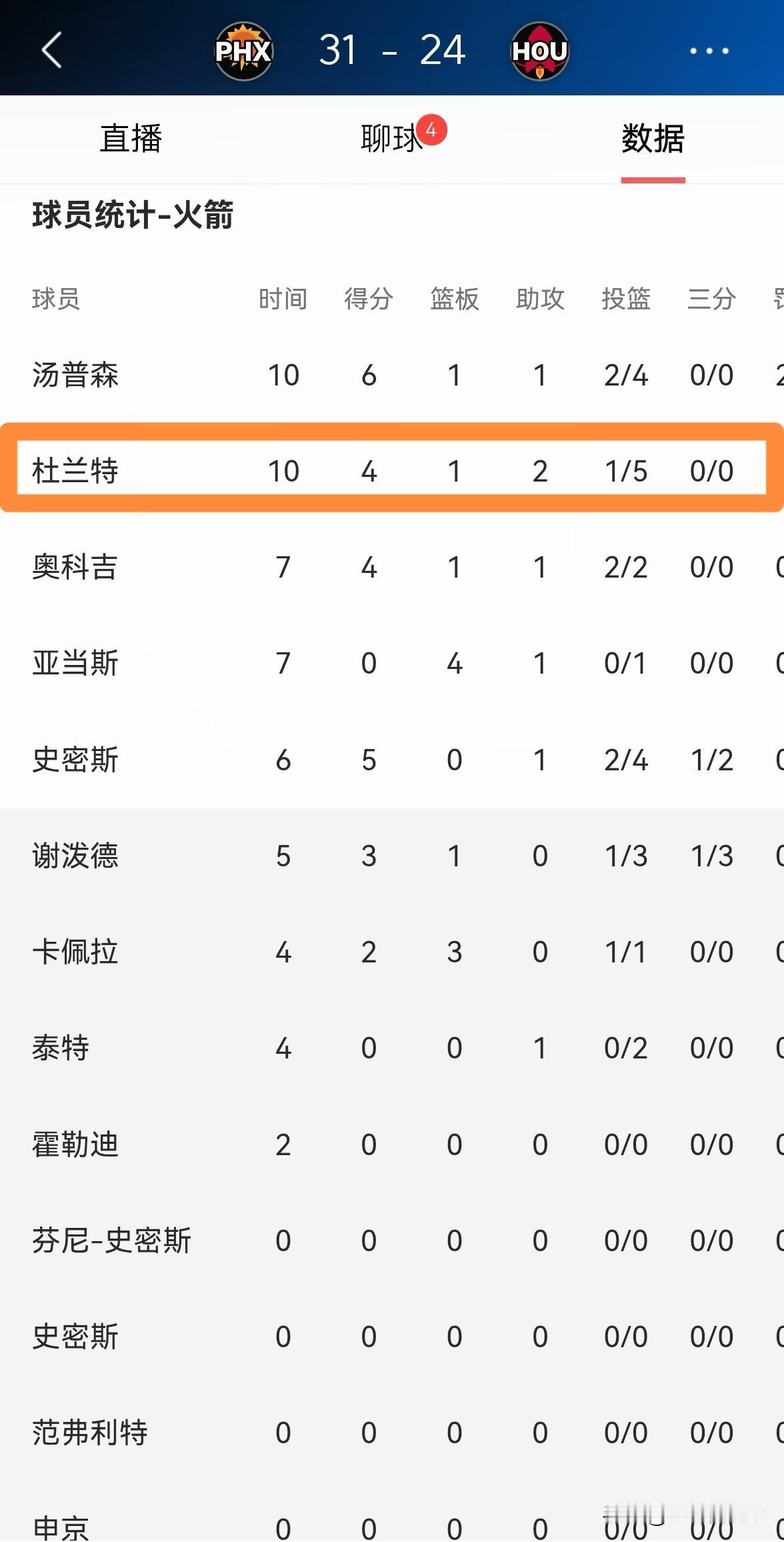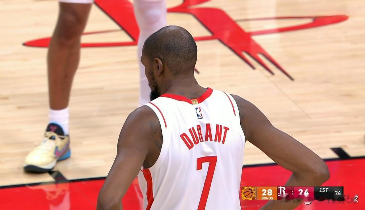 火箭超级巨星杜兰特真是烂透了!在今天火箭主场迎战太阳的比赛中,目前双方的首节比赛已经结束,火箭以24:31落后于对手。值得注意的是,在第一节比赛中,杜兰特首发出战10分钟,投篮5中1,其中罚球2中2仅仅得到可怜的4分,他的场上正负值为-3。 在如此备受期待的一场比赛中,杜兰特真是太拉胯了,他的风头完全被狄龙盖住了。