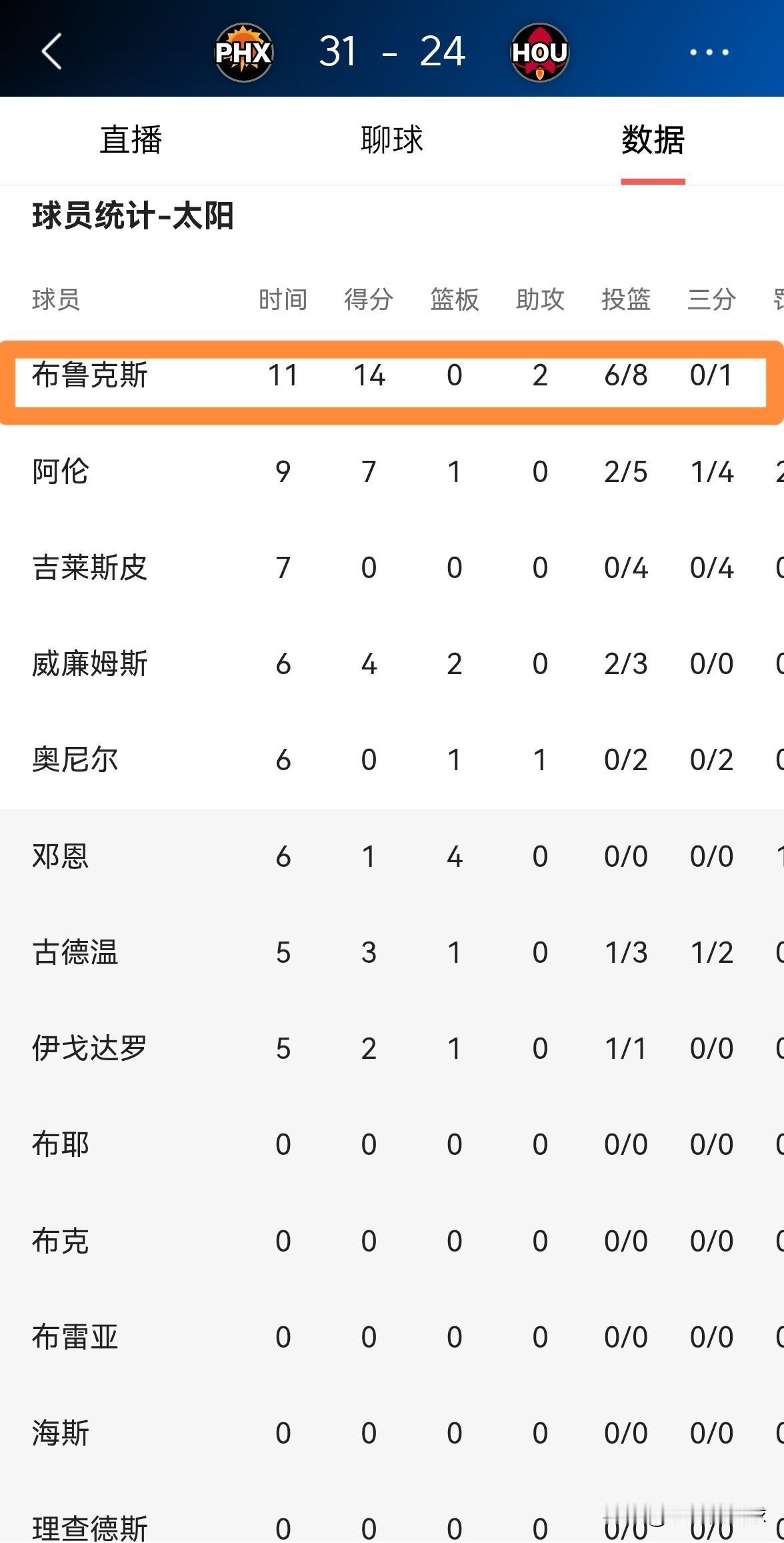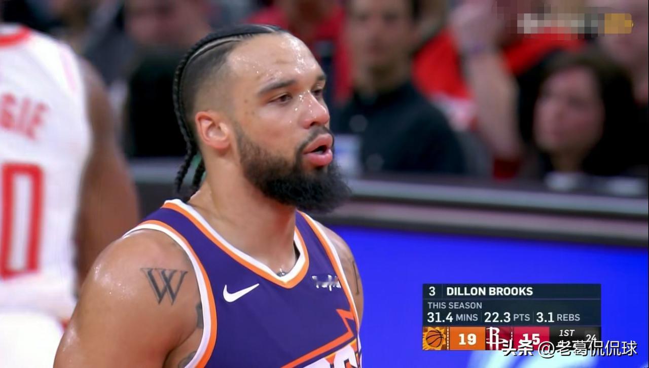 太阳超级巨星狄龙-布鲁克斯真是杀红了眼!在今天太阳客场挑战火箭的比赛中,目前双方的第一节比赛已经结束,太阳在狄龙的带领以31:24领先火箭。在首节比赛中,手感火热的狄龙首发11分钟,投篮8中6,其中罚球2中2爆砍14分2助攻0失误,他的场上正负值为+5。 值得一提的是,在第一节比赛中,狄龙的眼神里充满了怒火,他完全杀红了眼。
