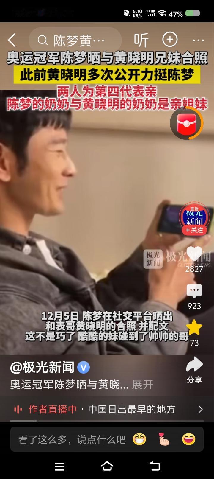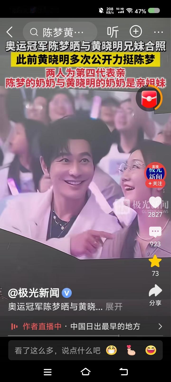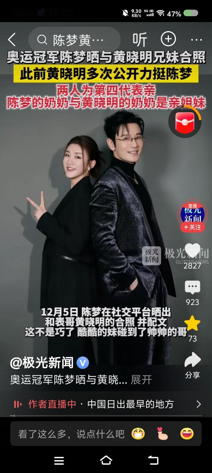 这是第四代表亲?—— 有报道称,奥运冠军陈梦晒与黄晓明的互动合照。两人的奶奶是亲姐妹,他俩是第四代表亲。 点评: 我数学不好,生物也不好,语文也不太好。万能的网友,你们帮我算算,他们第一代表亲是谁?