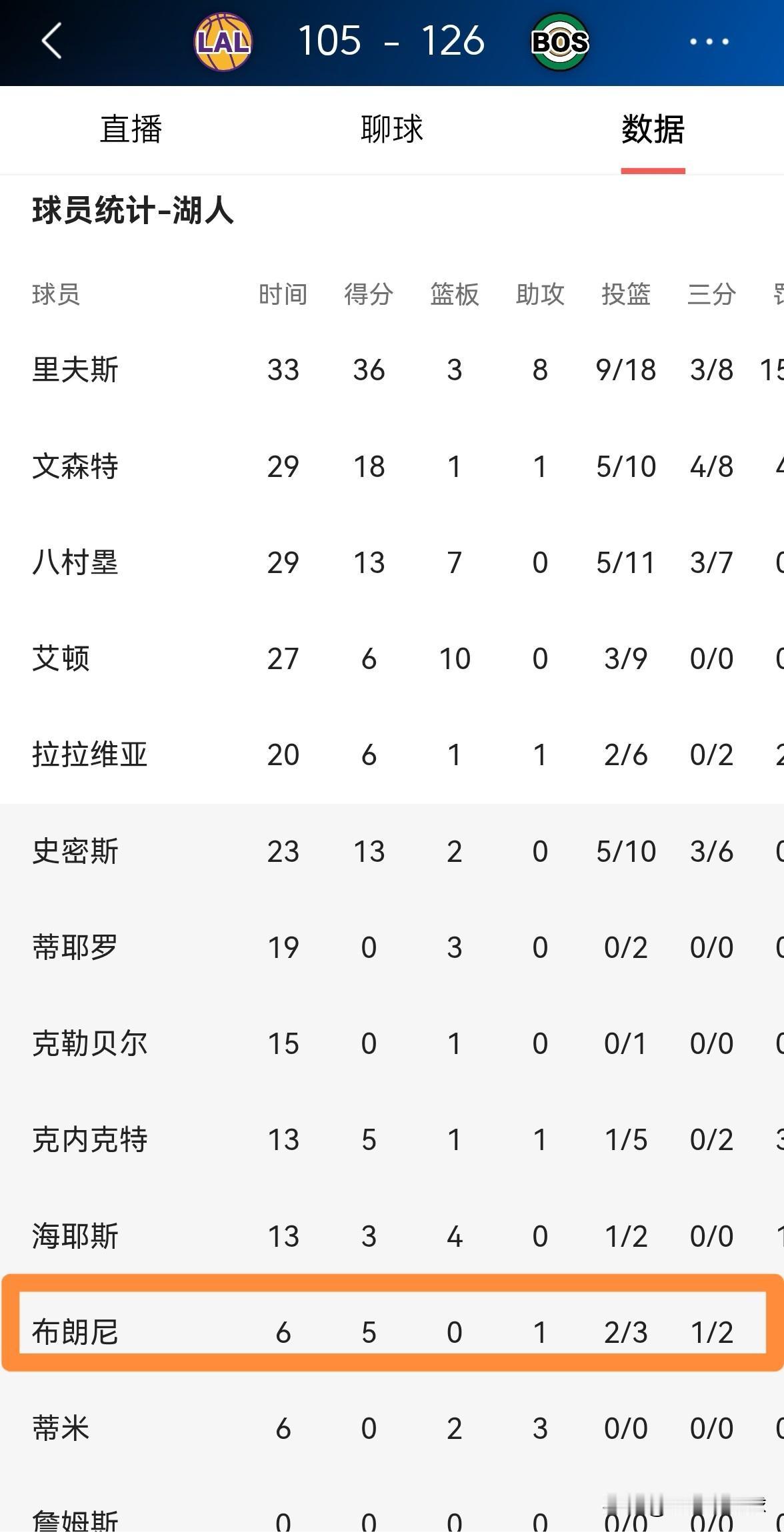 湖人超级新星布朗尼真是让人喜出望外!在今天湖人客场以105:126惨败于凯尔特人的比赛中,布朗尼终于再次得到了上场机会并且表现惊艳。 整场比赛下来,布朗尼替补出战6分钟,投篮3中2,其中三分球2中1非常高效的砍下5分1助攻1抢断,他的场上正负值为+4。 坦白说,如果湖人能够扶正布朗尼的话,我相信湖人的战绩会更上一层楼。