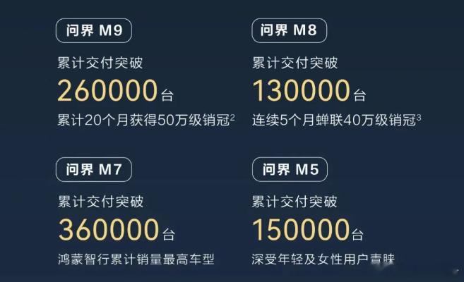 鸿蒙智行累计销量突破100万台12月5日,鸿蒙智行发布,历时43个月,旗下五界车型累计销量超过100万台,创中国新势力品牌最快百万交付达成记录。鸿蒙智行在11月突破81864台达成交付峰值,品牌月成交均价近39万持续领跑。旗舰车型M9累计交付突破26万台,独占整个鸿蒙智行的四分之一还多,累计20个月获得50万级销冠。新M8交付13万台,连续5个月领跑40万级市场。M5累计交付15万台。智界R7交付破10万台。享界S9T上市66天大定3万台。尚界H5上市43天交付1万台。尊界S800上市175天大定1.8万台,已连续三个月居70万级以上豪华车销量榜首。鸿蒙智行累计销量突破100万台问界M9累计交付26万辆问界m8四十万级销冠尚界h5智界R7尊界S80011月交付超2000台