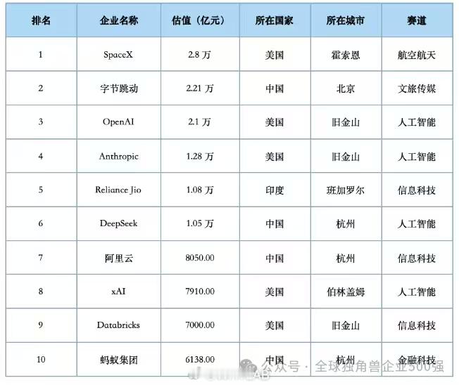 2025 全球独角兽企业 500 强前十中美企业占了 9 家,另外一家是印度的,基本上都跟科技相关:SpaceX字节跳动OpenAIAnthropicReliance JioDeepSeek阿里云xAIDatabricks蚂蚁集团